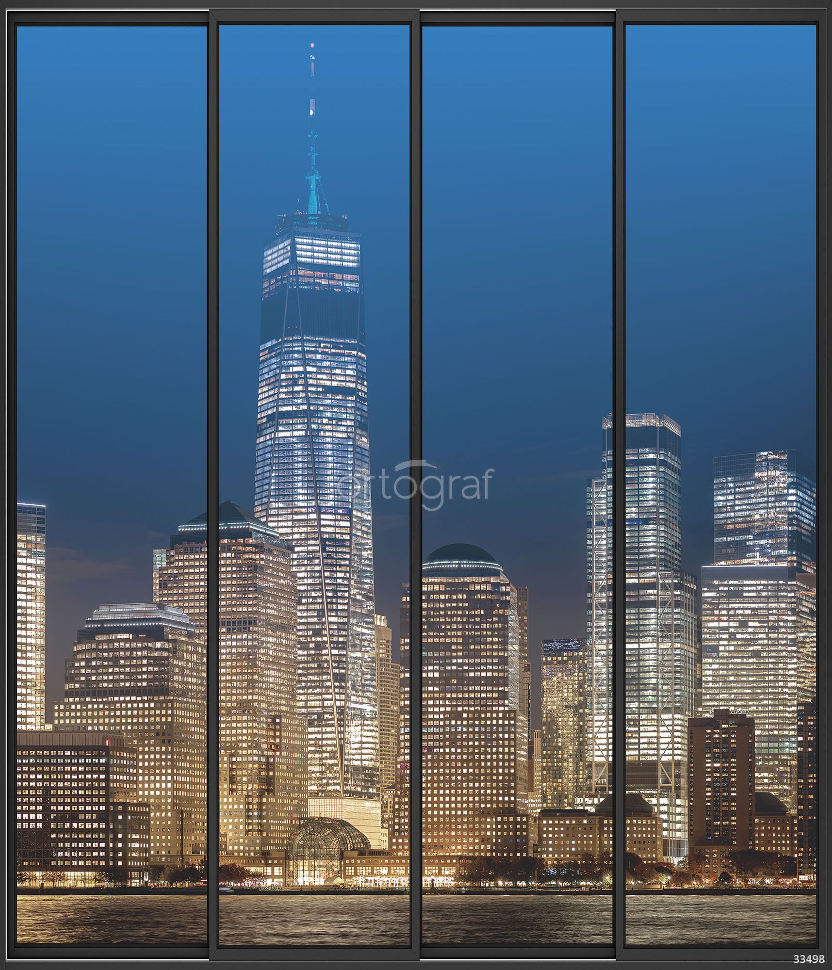 Вид на панорамный городской пейзаж с высотными зданиями и сверкающими огнями, словно сквозь большое окно, создает атмосферу современного мегаполиса и динамики городской жизни. Такое оформление добавит помещению урбанистический стиль и визуальную глубину, подойдет для зон с активной атмосферой либо стильного уединения. Особенно гармонично будет смотреться в офисе, гостиной или прихожей.