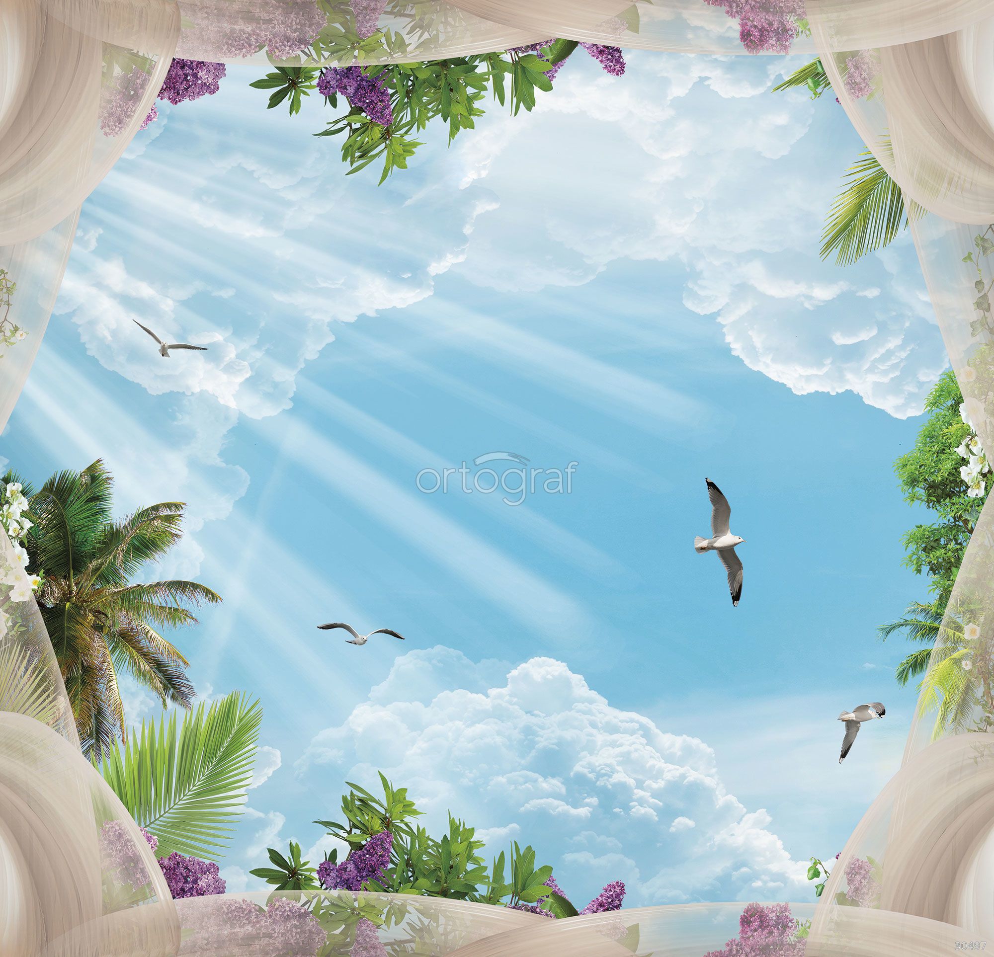 Летний небо с облаками, яркими солнечными лучами и свободно парящими чайками обрамлено цветущими растениями, пальмами и лёгкими драпировками. Панорамная композиция создаёт ощущение простора, свежести и лёгкости, словно вид из воздушной беседки на тропическом берегу. Подойдет для спальни, гостиной или зоны релакса, где хочется добавить света и природной гармонии.