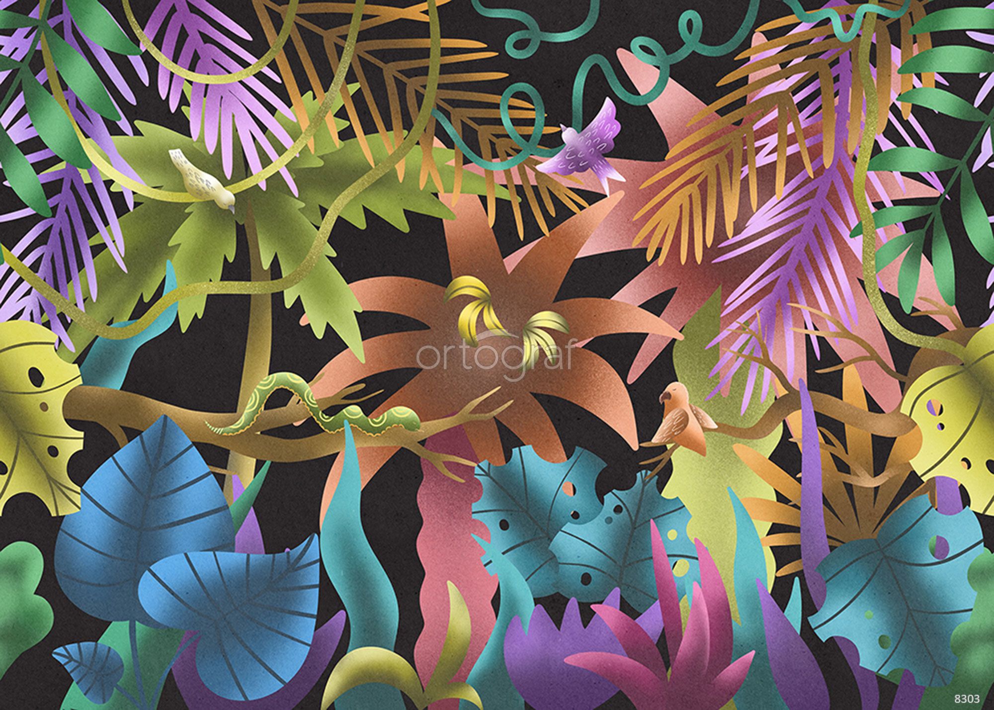 Графичная композиция с экзотическими растениями и тропическими птицами создает атмосферу джунглей и дикой природы. Такой рисунок добавляет энергии, динамики и современности в интерьер, отлично подойдет для ярких и креативных пространств. Особенно хорошо впишется туда, где хочется добавить нотку экзотики и уюта, вдохновляющего на творчество и мечты.