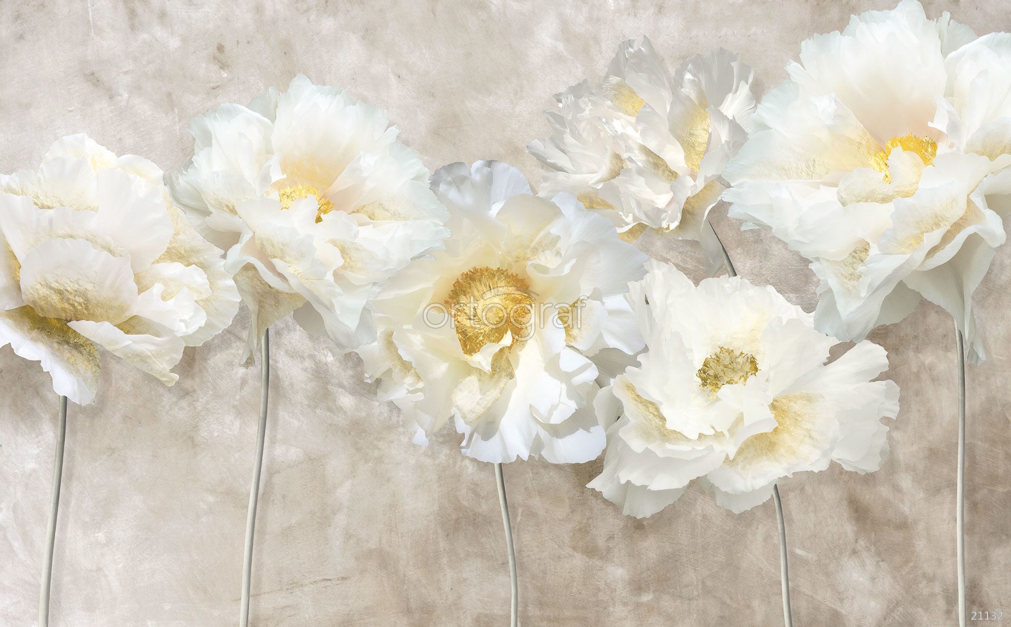 Сюжетные обои изображают крупные цветы с волнистыми лепестками, собранные в аккуратную рядовую композицию на текстурном фоне. Лёгкая воздушность формы и плавные линии создают впечатление невесомости и элегантной декоративности, идеально подходящей для современного интерьера.