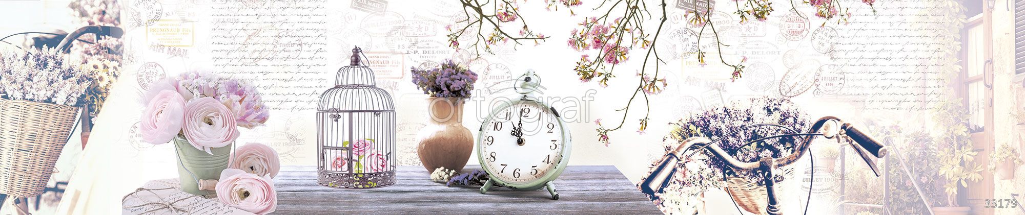 На изображении легкая романтичная композиция: корзины и букеты с цветами, винтажные часы, клетка, ветки с цветами и велосипед, детали французского уюта и ретро-почтовые элементы на фоне. Такой сюжет создаёт атмосферу нежности, вдохновения и безмятежности, добавляя интерьеру нотки винтажной элегантности. Особенно хорошо будет смотреться там, где важен уют и декоративный шарм.