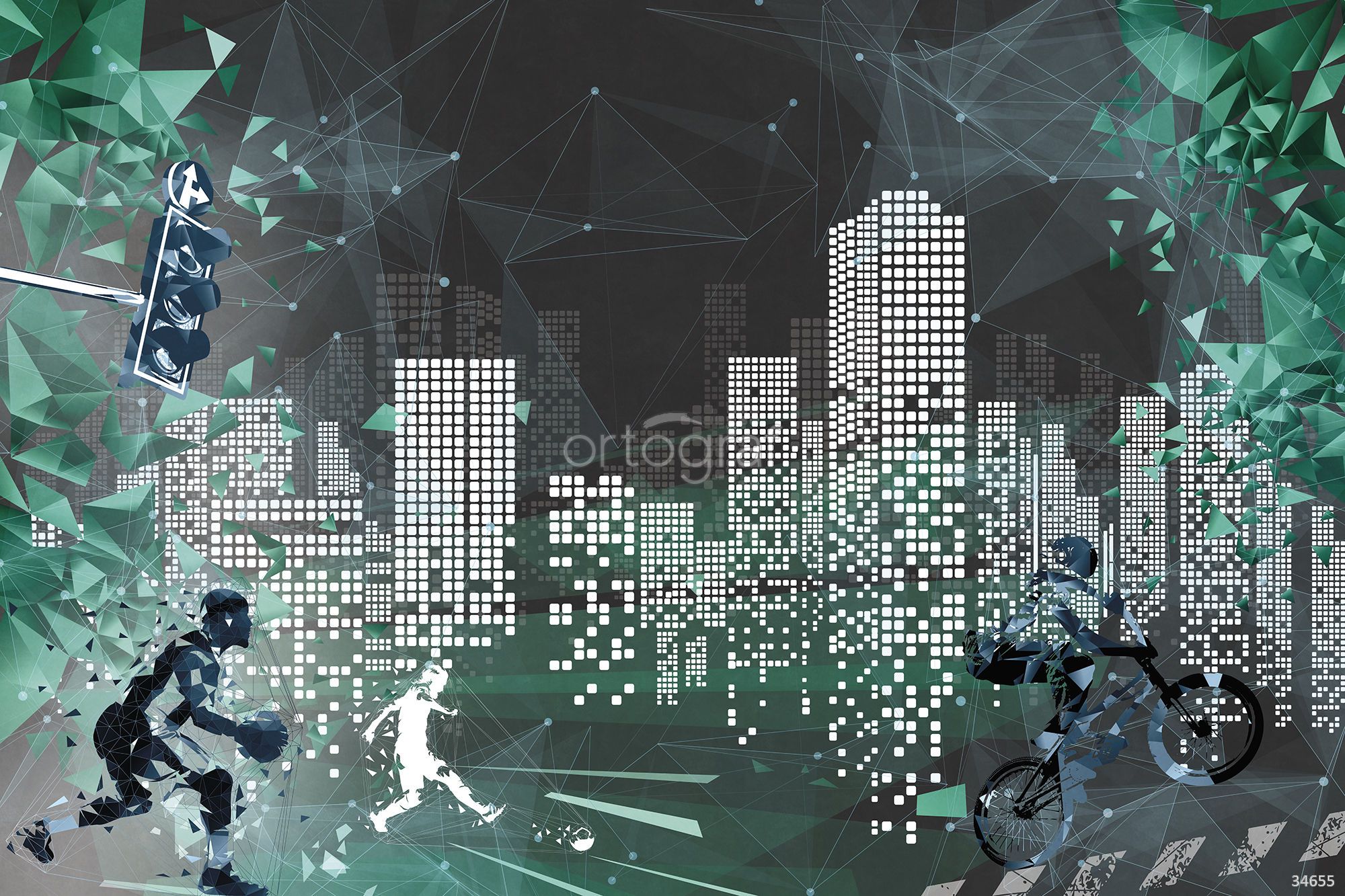 Динамичная сцена большого города с абстрактными фонами, изображая баскетболиста, байкера и силуэт футбольного игрока на фоне светящихся многоэтажных зданий и светофора. Атмосфера энергии, спорта и городского ритма отлично оживляет современный интерьер и вдохновляет на движение. Такой рисунок идеально подойдет для молодежной комнаты, для детской, прихожей и коридора или офисного пространства.