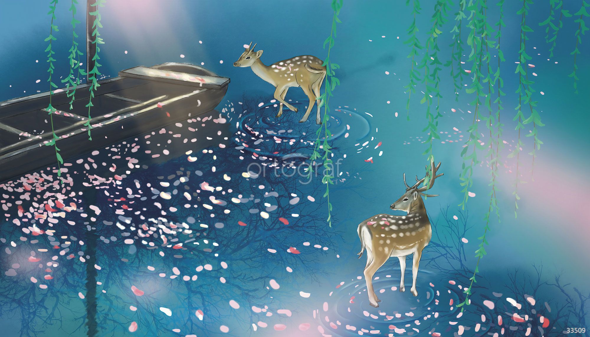 Сказочная сцена с оленями в воде среди лепестков и свисающих ветвей, рядом с лодкой, создает атмосферу уюта, спокойствия и загадочности. Такой рисунок наполняет интерьер мечтательностью и гармонией, идеально подходит для пространства, где хочется расслабиться или окунуться в мир фантазии. Особенно хорошо подойдет для детской, спальни или гостиной.