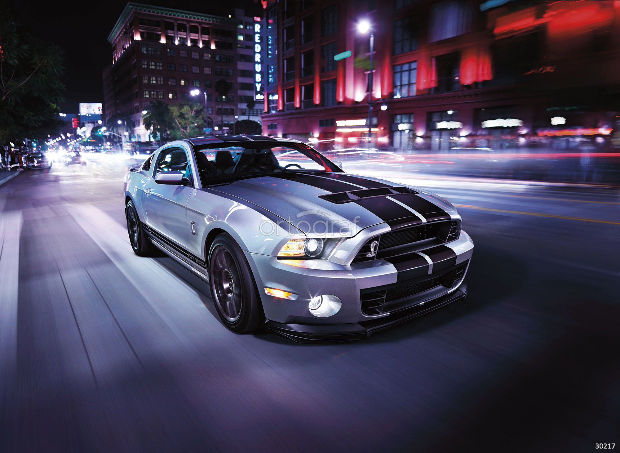 На изображении изображён серебристый спортивный автомобиль Ford Mustang Shelby GT500 с черными полосами, мчащийся по ночному городскому проспекту среди световых дорожек от фонарей и неоновых вывесок. Динамичная композиция подчёркивает скорость, мощь и спортивный стиль машины, а городской фон с яркой подсветкой усиливает атмосферу современного мегаполиса.