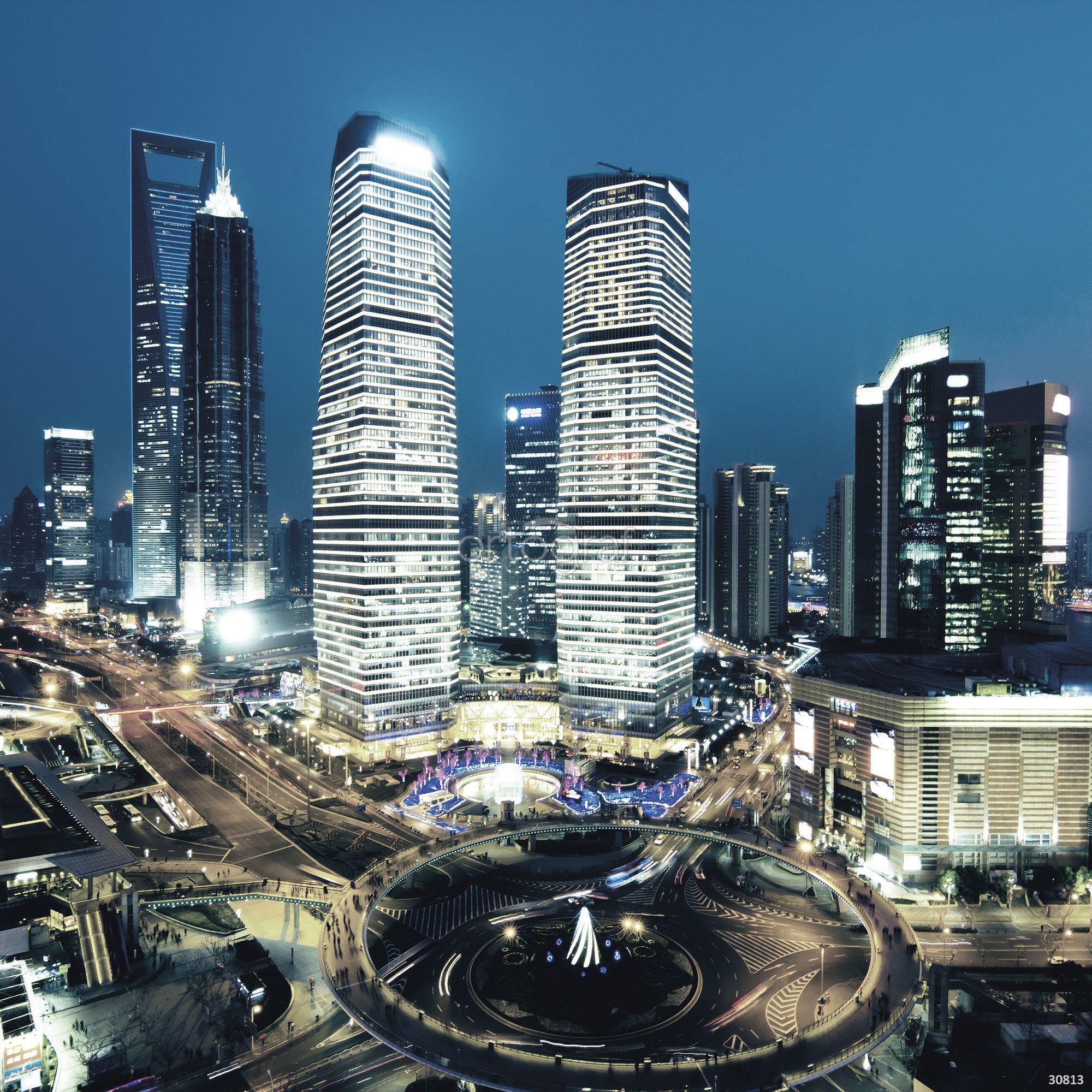 Современный ночной городской пейзаж с высотными зданиями, яркой иллюминацией и круговой развязкой с парком создает атмосферу динамики, урбанистики и технологичности мегаполиса. Такой сюжет отлично подходит для интерьерных решений в стиле хай-тек и офисных пространств.