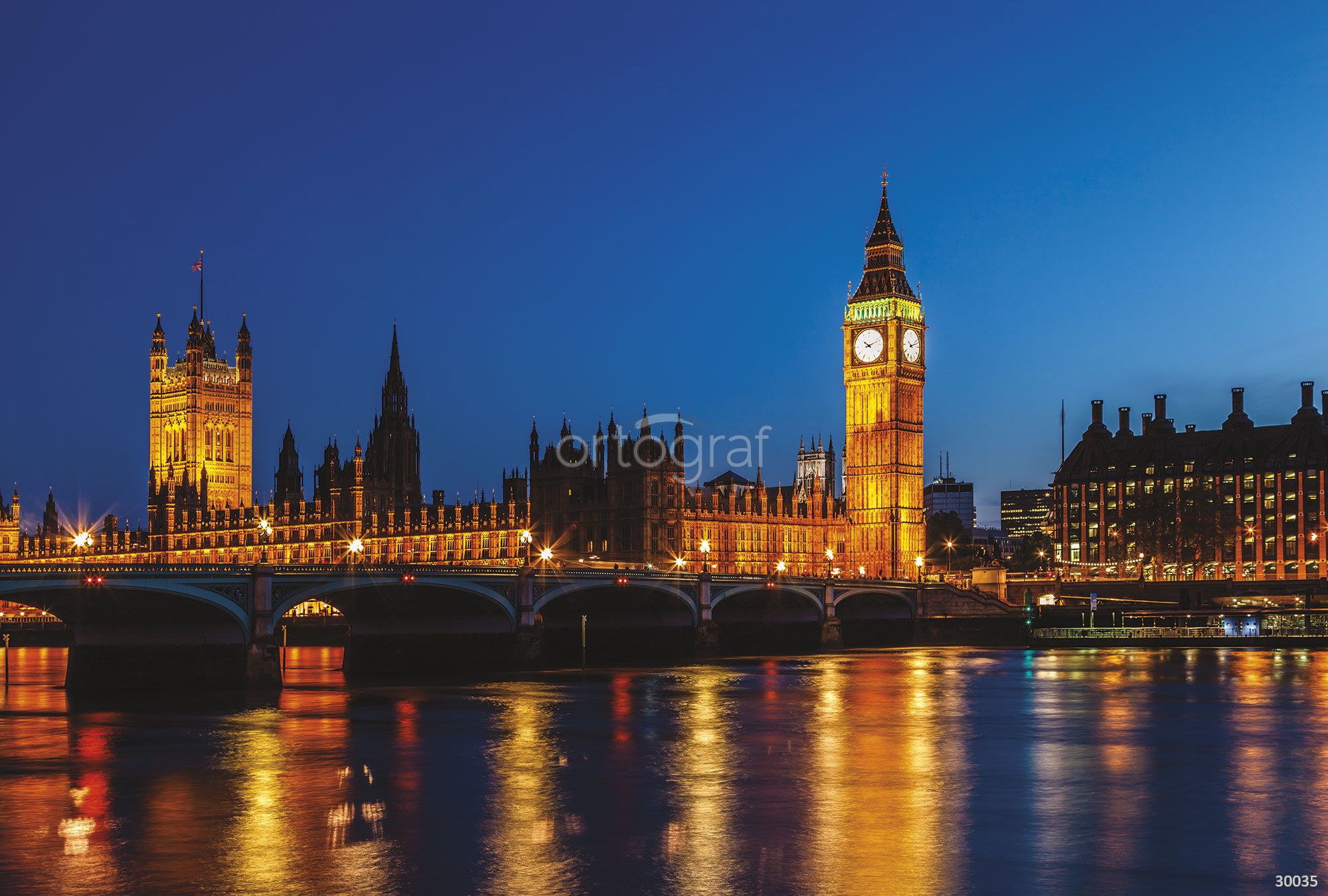 Вечерний вид на знаменитый Биг-Бен и здание парламента в Лондоне. На переднем плане — мост Вестминстер, пересекающий Темзу, поверхность которой отражает золотой свет уличных фонарей и фасада. Глубокий синий небосклон подчёркивает атмосферу города в сумерках, а архитектурная подсветка выделяет детали башен и готических украшений дворца Уэстминстер.