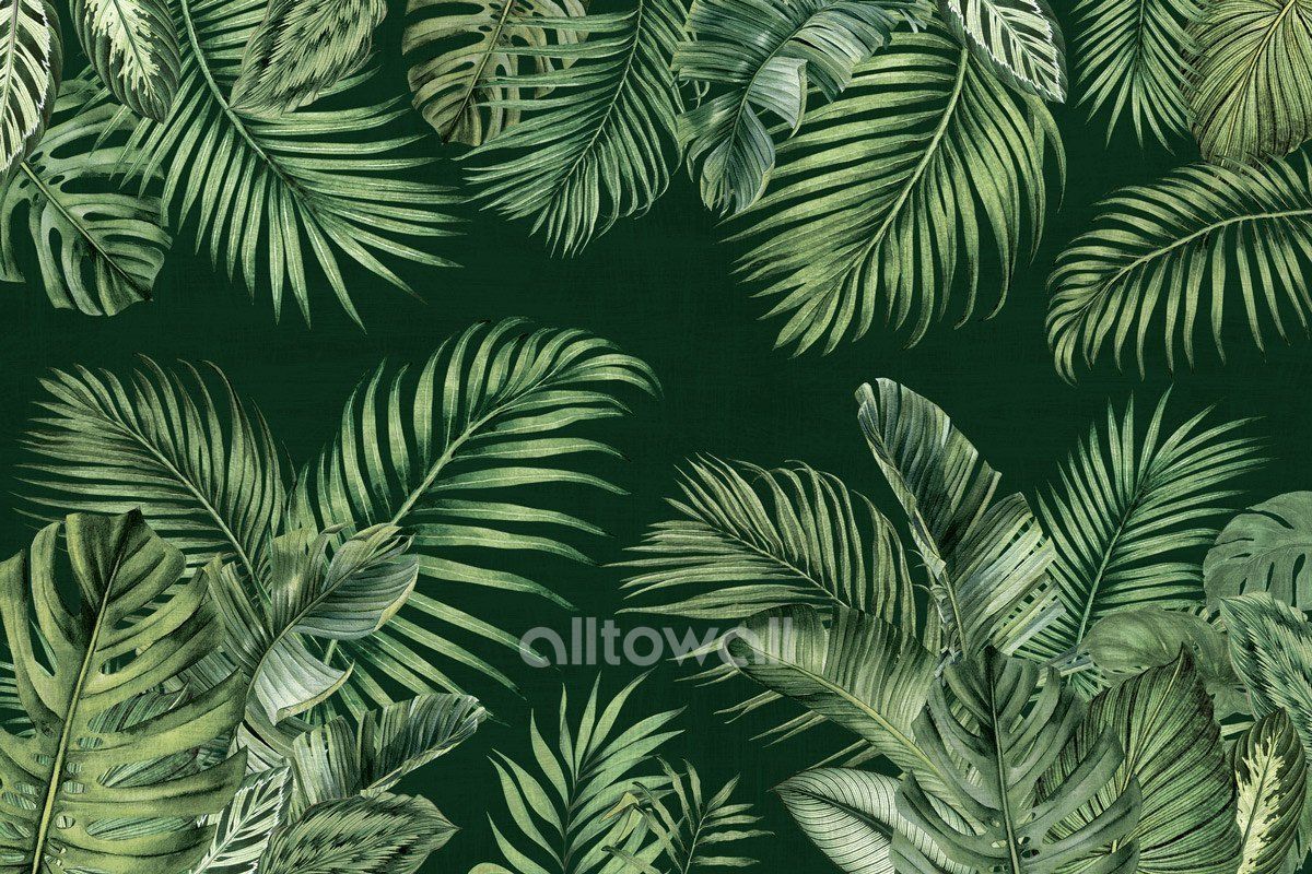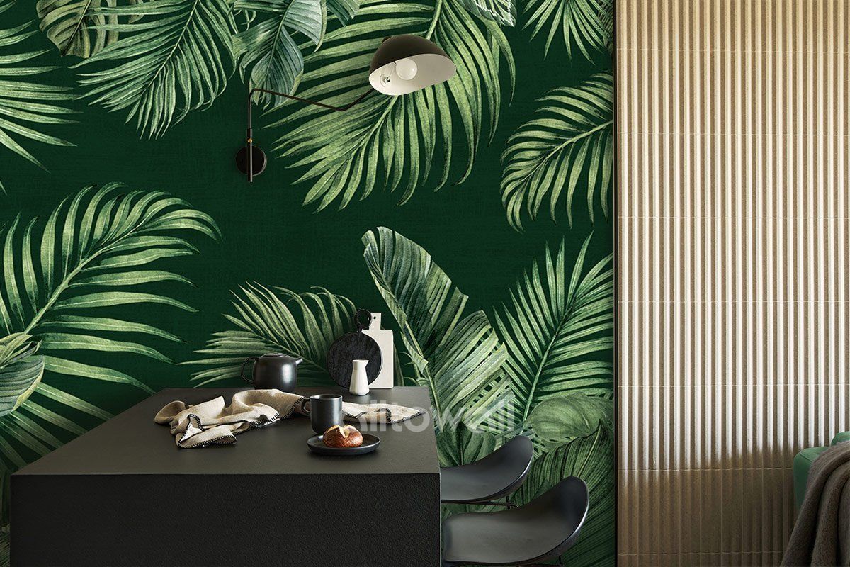 Яркие тропические обои для смелых интерьеров. Зеленый цвет, как известно, бодрит, заряжает хорошим настроением и добавляет уютные природные нотки. В этом сюжете два оттенка зеленого: насыщенный фон и листья монстеры в главной роли.
