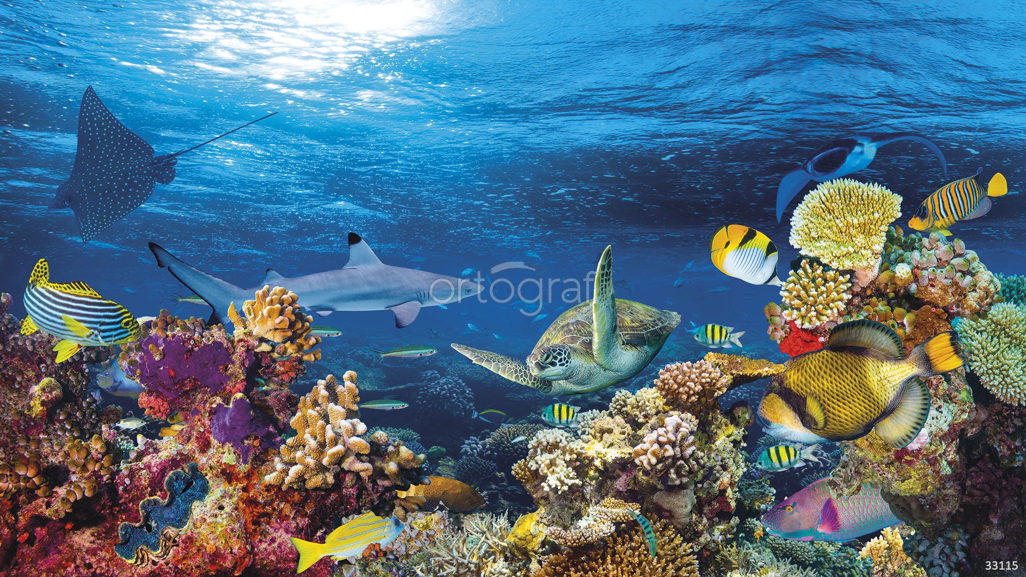 На изображении изображён красочный подводный мир с множеством видов рыб, кораллов, ската, черепахи и акулы. Океаническая сцена наполнена жизнью и движением, создаёт ощущение присутствия в тропическом рифе. Такой сюжет отлично подойдет для создания динамичной и яркой атмосферы в современном или семейном интерьере.