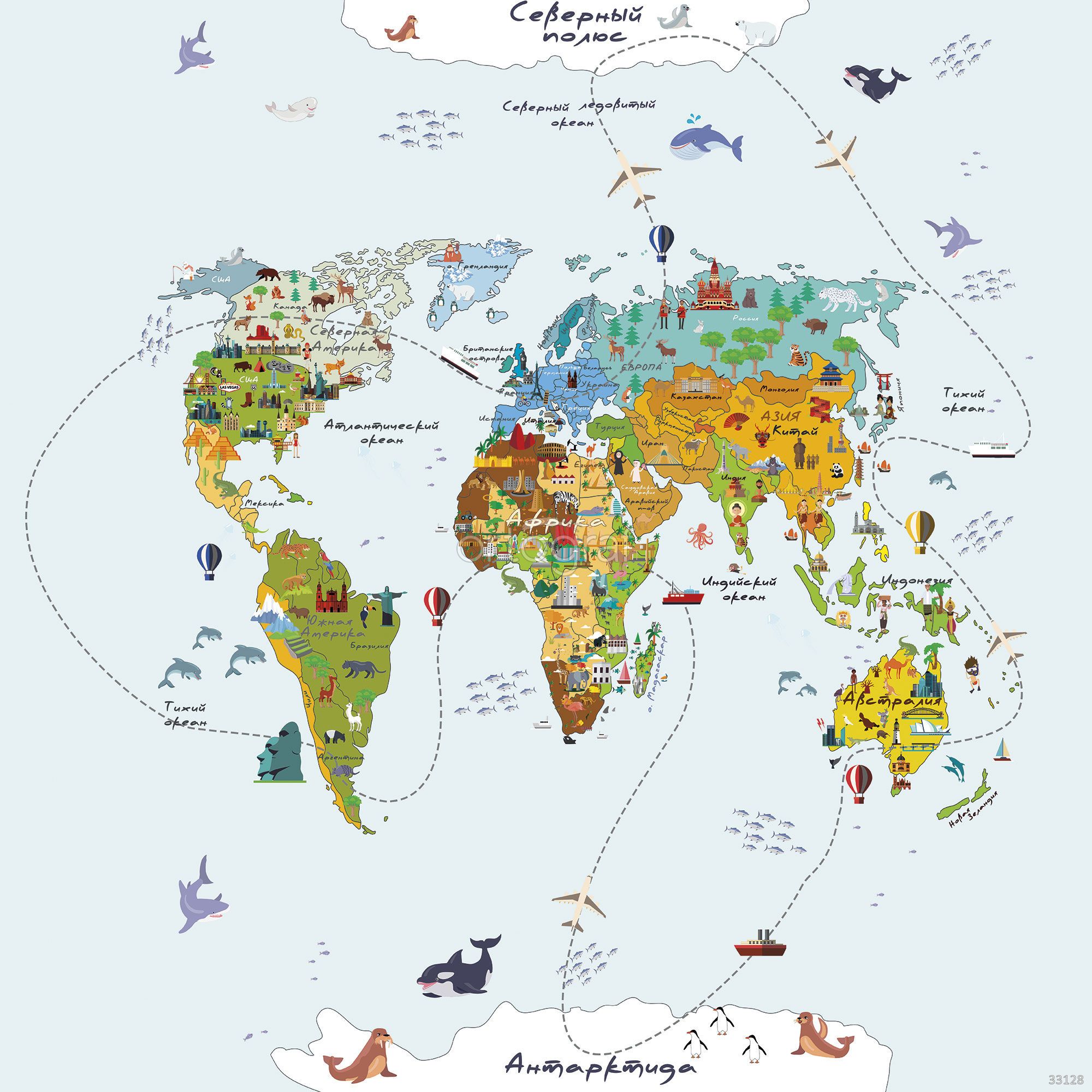 На изображении представлена карта мира с названиями частей света и океанов на русском языке, дополненная иллюстрациями животных, достопримечательностей, растений, кораблей, самолетов и воздушных шаров. Сюжет выполнен в описательно-игровой манере, что делает его не только познавательным, но и очень привлекательным для детей. Такая карта идеально подходит для обучения и декора пространства, где важна визуальная информация и игровой элемент.