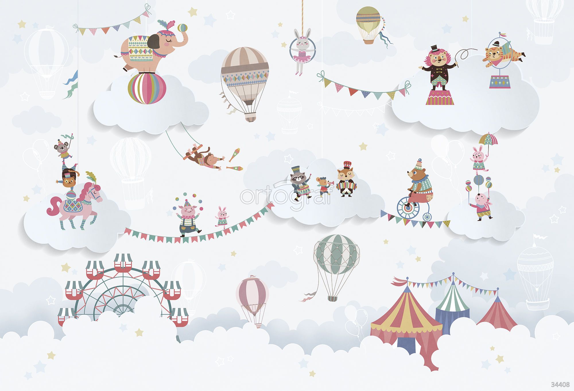 Сюжет показывает сказочный цирк с ярмаркой, животными-артистами, воздушными шарами, каруселью, гирляндами и облаками. Иллюстрация наполнена атмосферой веселья, мечты и игры, идеально подходит для создания пространства с творческой, праздничной и волшебной атмосферой. Такой рисунок отлично впишется в помещения для отдыха, развлечений или детской активности.