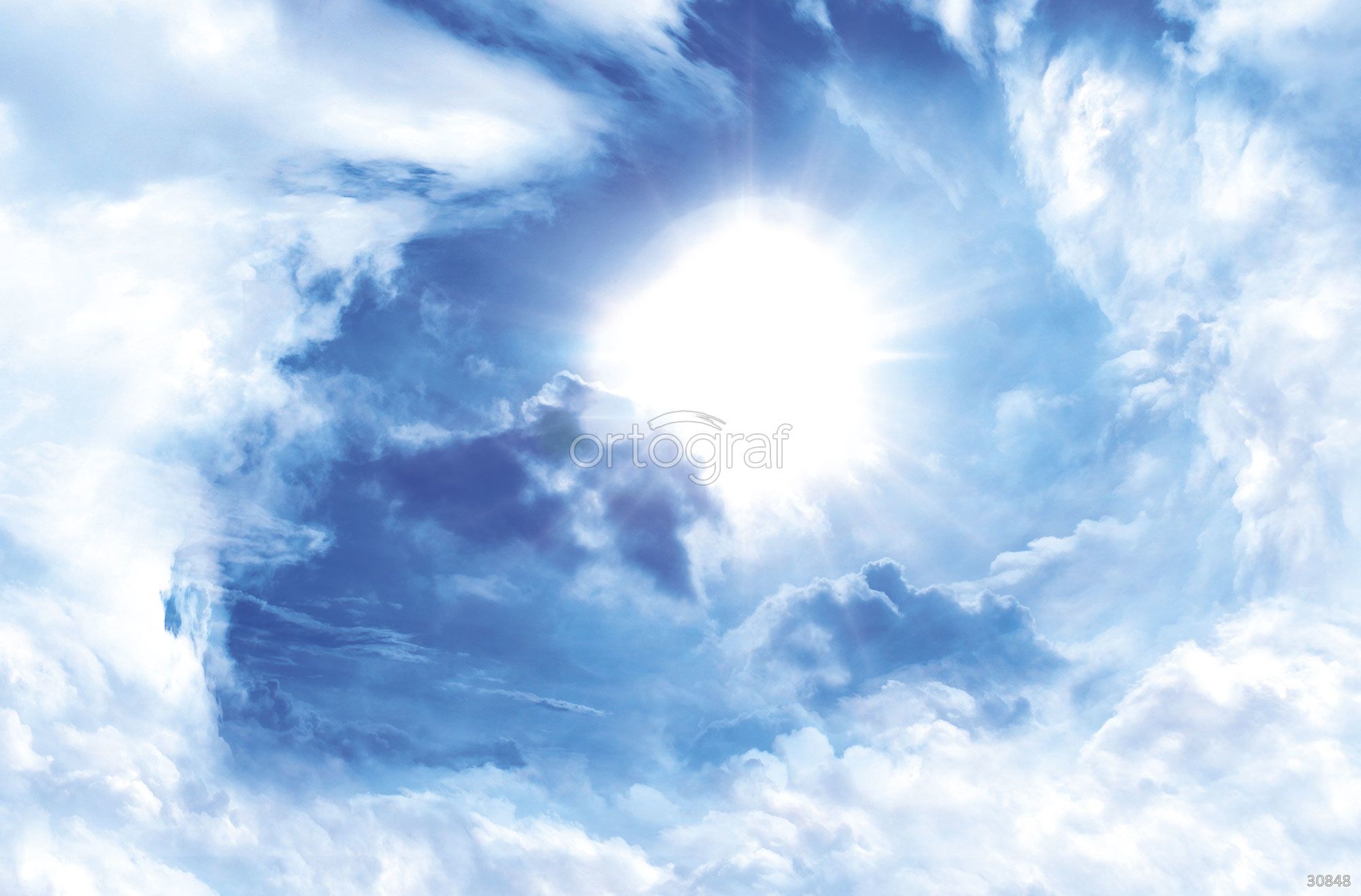 Солнечные лучи пробиваются через облака на голубом небе, создавая ощущение свежести, воздуха и света. Такой сюжет отлично наполняет помещение светом, визуально увеличивает пространство и гармонирует с современными интерьерами.
