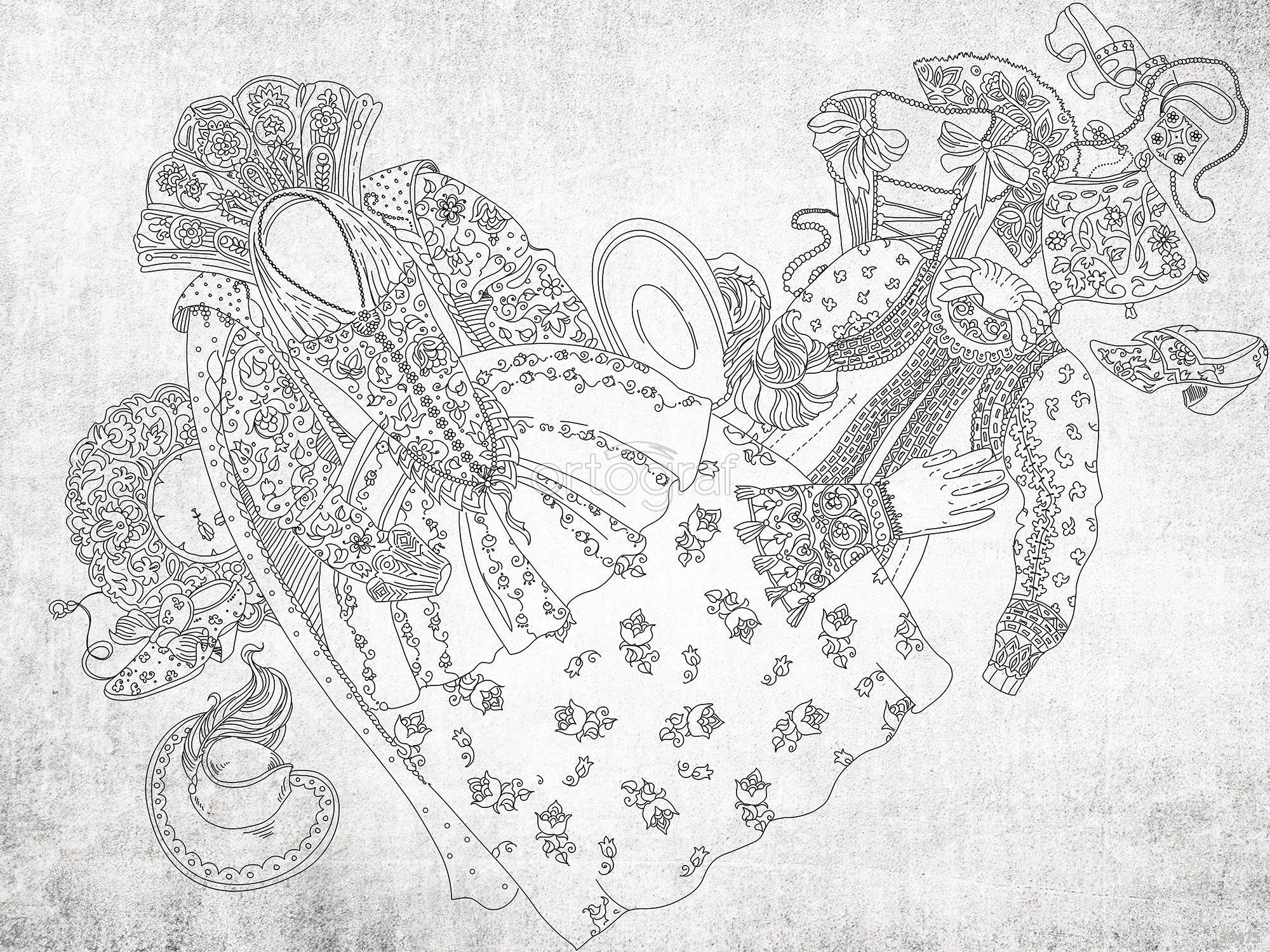 Графичная композиция с изображением пары в старинных костюмах, украшенных сложными орнаментами и росписью, на фоне едва заметной текстуры. Сюжет напоминает иллюстрацию из народных сказок или исторических хроник, создаёт атмосферу изысканности и культурного наследия. Лучше всего подойдет для кабинета, библиотеки, тематической гостиной или арт-пространства.