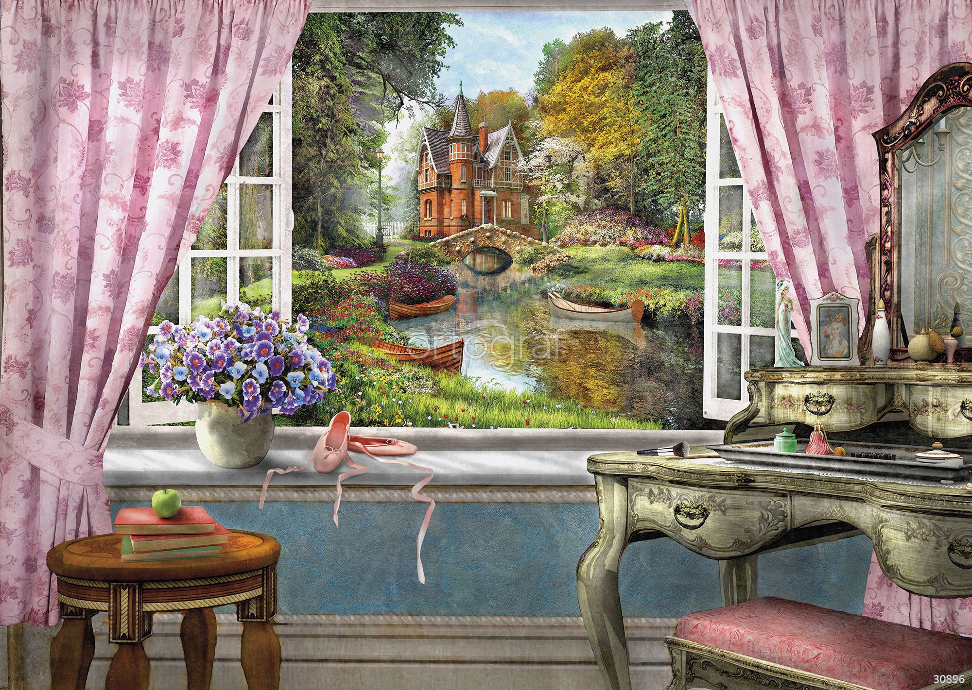 Уютная романтическая сцена с видом из окна на сказочный сад, лодки, пруд и красивый дом с башнями. Интерьер дополнен старинной мебелью, букетом и балетными туфлями, что создает атмосферу мечтательности и уюта. Такой сюжет визуально расширяет пространство и добавляет нотки нежности и волшебства в интерьер.