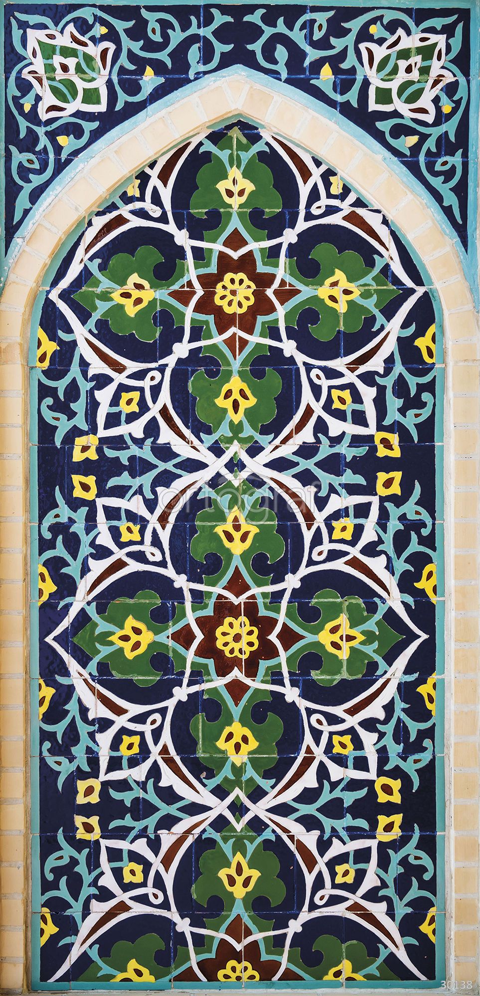 Изображение представляет собой декоративную арку, заполненную сложным восточным орнаментом с симметричными переплетениями, стилизованными цветочными и геометрическими мотивами. Композиция напоминает архитектурный элемент, украшенный мозаикой, типичной для традиционных интерьеров мечетей или дворцов Востока.