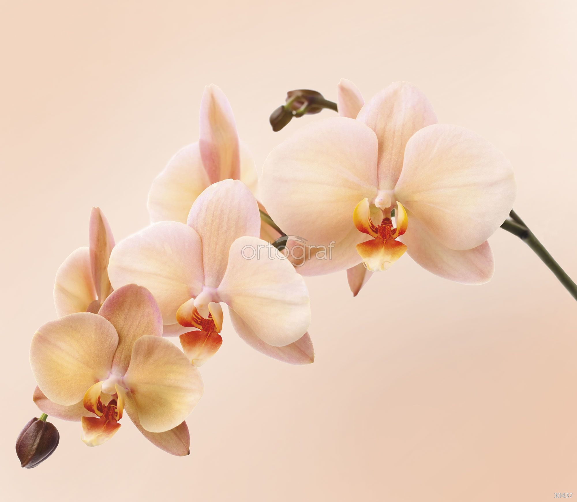 На изображении показана изящная ветка с крупными цветками орхидеи, расположенными в небольшой группе. Фон мягко размыт, что подчёркивает утончённость формы и гармонию натуральной композиции.