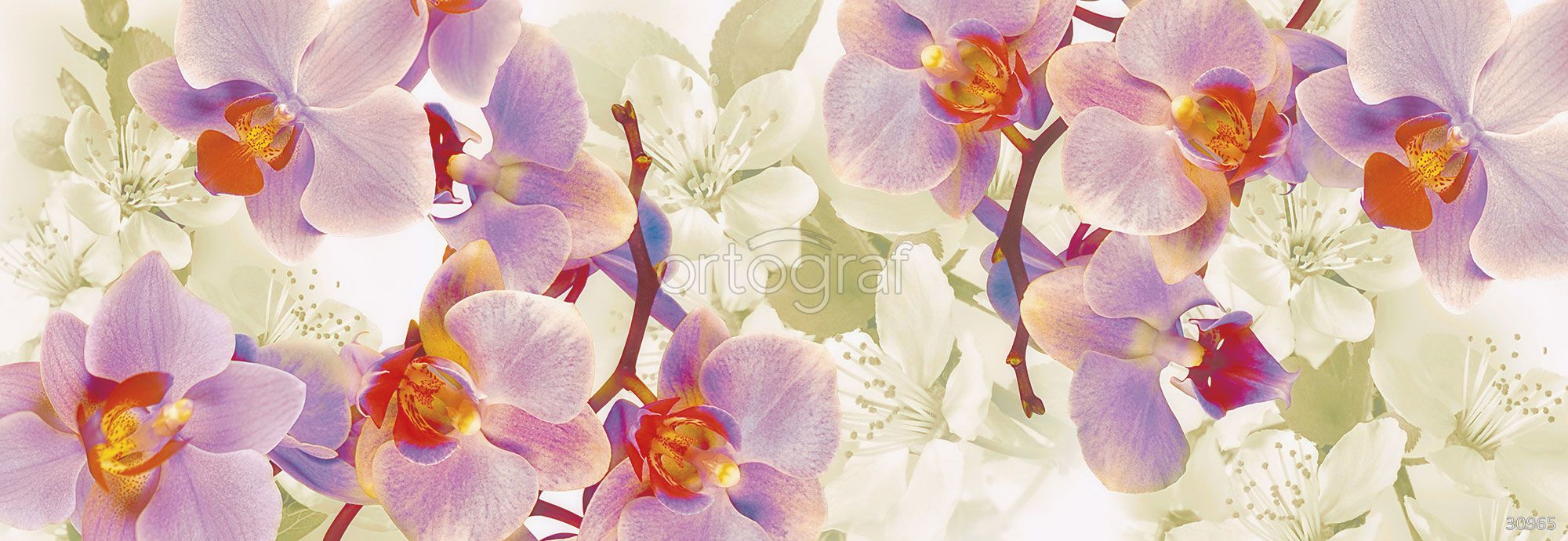 На изображении изображены крупные цветки орхидеи и веточки с распустившимися цветами на светлом фоне. Композиция создает ощущение свежести, легкости и весеннего настроения, придаёт интерьеру воздушность и жизнерадостность. Такой рисунок идеально подойдет для оформления пространства, где важна атмосфера уюта и бодрости.