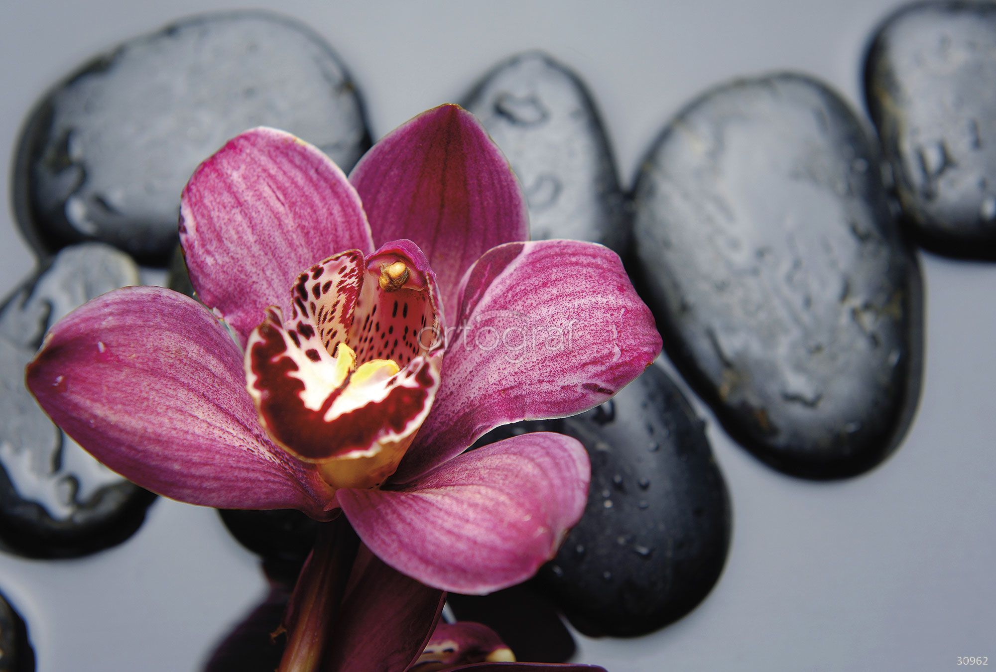 На изображении показан крупный цветок орхидеи в сочетании с гладкими камнями на фоне воды. Композиция создает ощущение спокойствия, гармонии и природной красоты, прекрасно подойдет для интерьера, где важна атмосфера уюта и релаксации. Такой сюжет впишется в современные и классические помещения, добавив нотку изысканности.