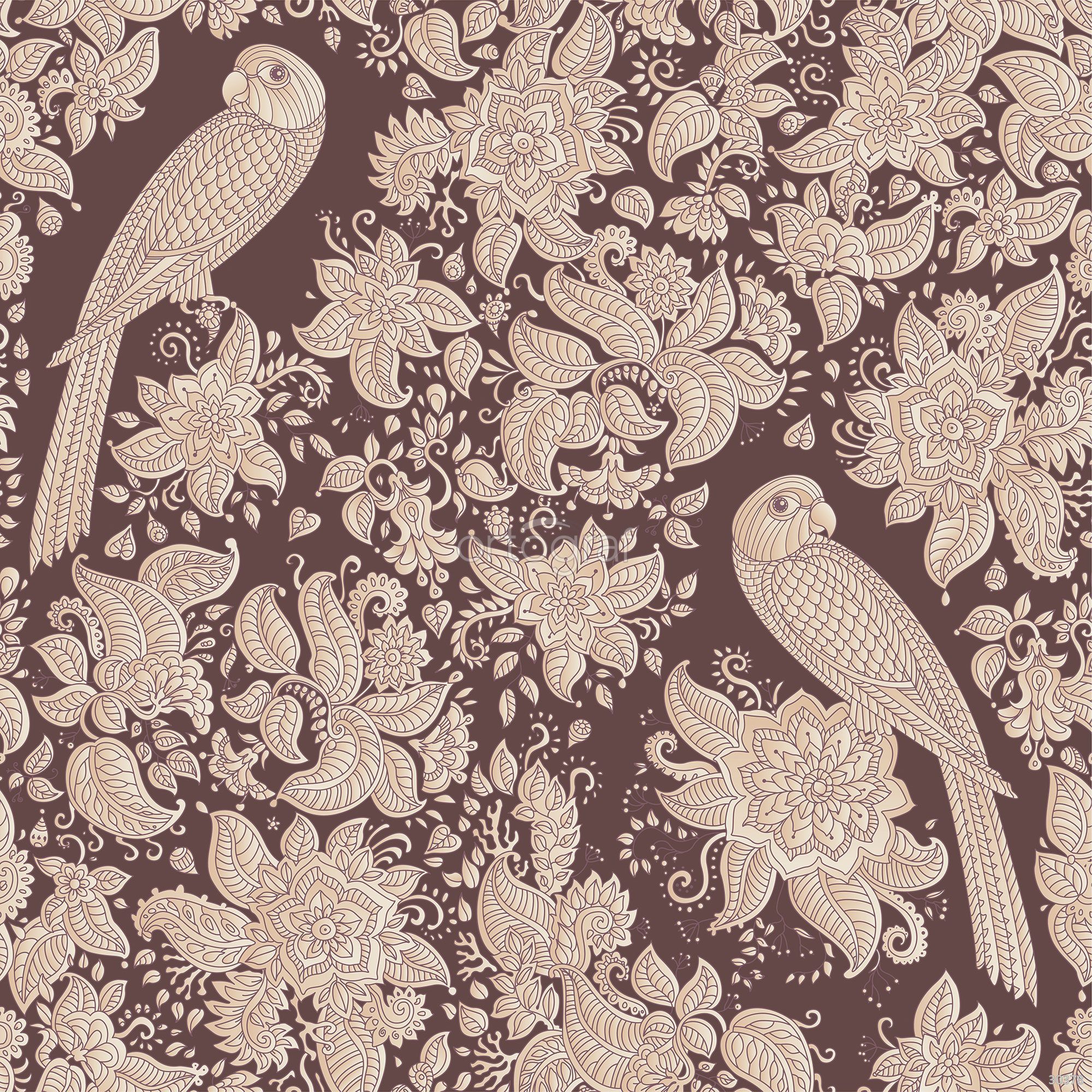 На изображении изображён декоративный узор с изящными попугаями, сидящими среди пышных стилизованных цветов и листвы, выполненный в технике орнамента. Композиция наполнена множеством растительных мотивов, плавных линий и повторяющихся элементов, создающих ощущение утончённости и богатого декора.