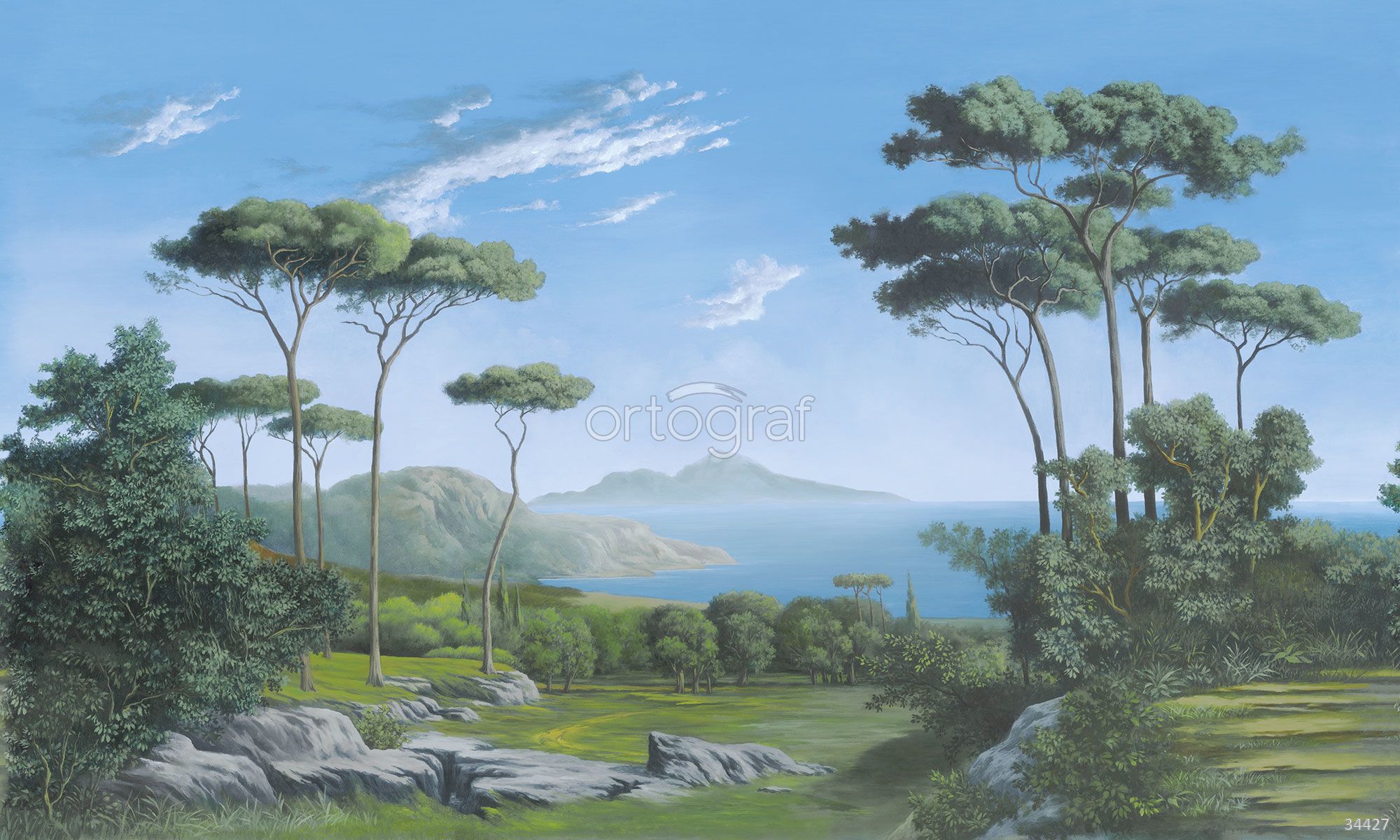 На изображении представлен средиземноморский пейзаж с высокими деревьями, густыми кустами и скалами на фоне моря, острова и голубого неба с облаками. Композиция наполняет пространство ощущением свободы, природы и лёгкости, идеально для создания спокойной и свежей атмосферы. Такой сюжет хорошо впишется в интерьеры, где ценятся уют, гармония и естественный свет.