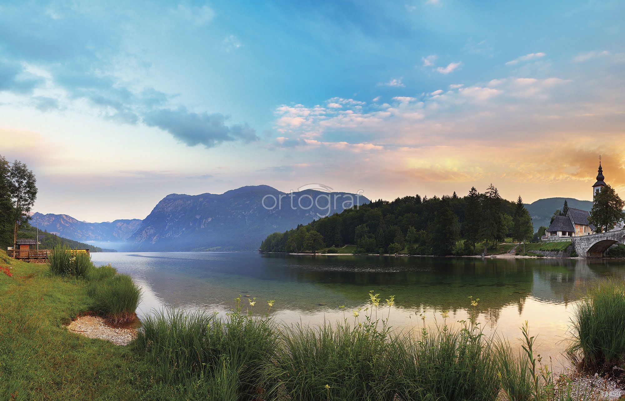 Панорамный пейзаж с озером, зелёными берегами, горами и церковью на фоне утреннего или вечернего неба создает атмосферу спокойствия и простора. Такой сюжет отлично передает естественную красоту природы, добавляет интерьеру ощущение свежести и гармонии. Идеален для зон отдыха и пространств, где нужен визуальный контакт с природой.