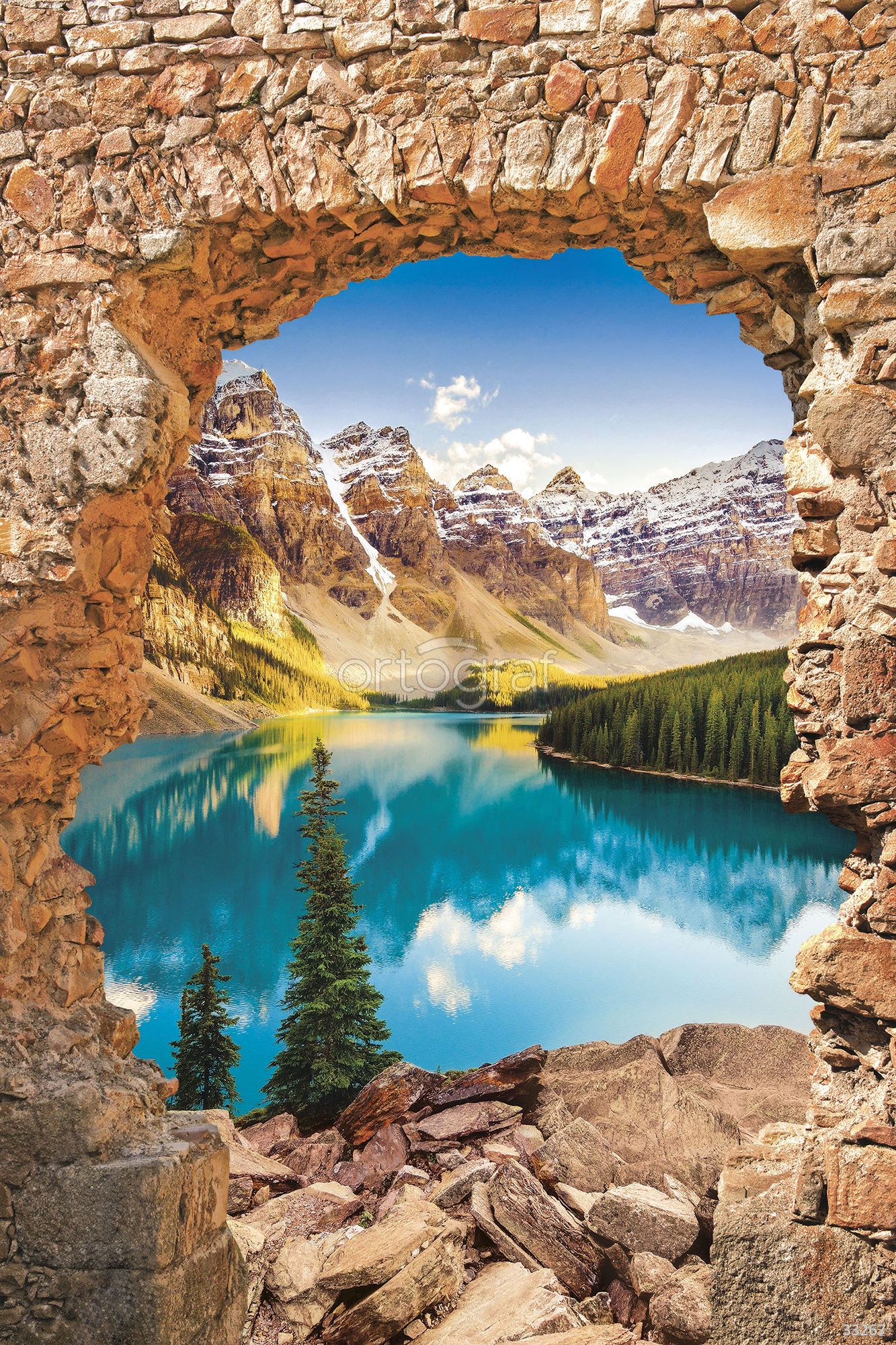 Арочное каменное окно открывает живописный вид на горное озеро, лес и заснеженные вершины, создавая эффект глубины и пространства. Такой сюжет способствует созданию атмосферы природы и спокойствия в интерьере, визуально расширяет комнату и приносит свежесть. Особенно уместен в светлых и уютных жилых зонах.