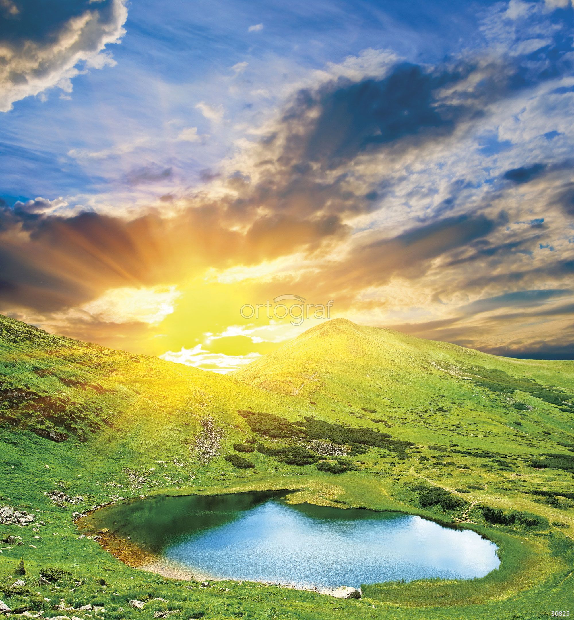 Горный пейзаж с озером, зелёными склонами и восходящим солнцем через облака создаёт ощущение свежести, энергии и вдохновения. Такой сюжет наполняет интерьер светом и пространством, отлично подходит для создания ощущения природы и уюта.
