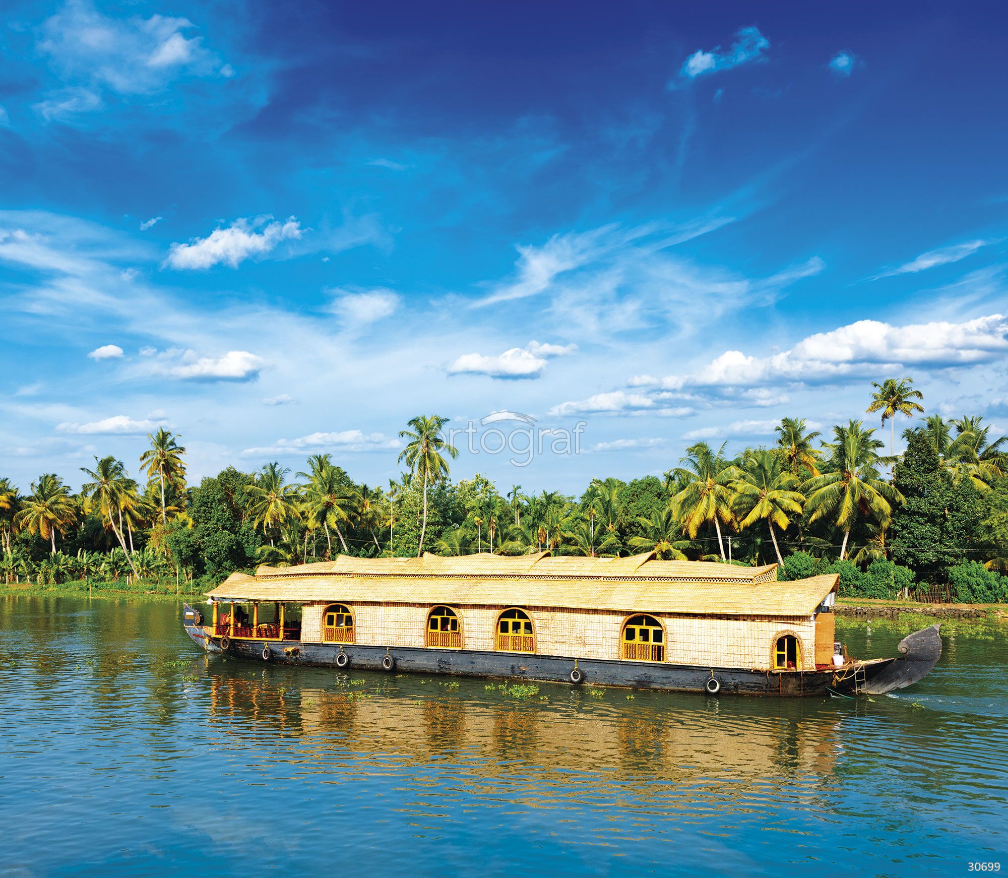 Экзотический пейзаж с традиционной лодкой-домом, пальмами и спокойной речной гладью создает атмосферу путешествия и уюта. Такое изображение привносит в интерьер нотки экзотики и расслабления, наполняет пространство чувством гармонии и спокойствия. Идеально подойдет для оформления помещения, где хочется добавить атмосферу отдыха и мечтаний.
