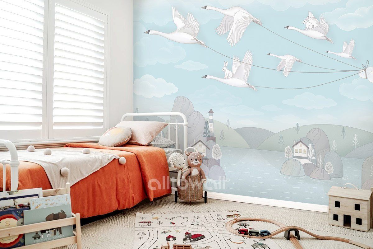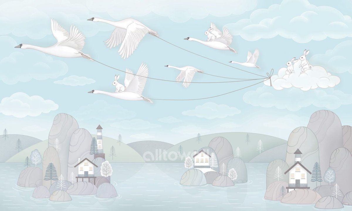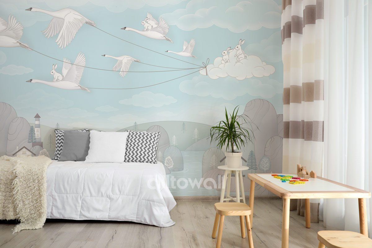Нежный сюжет о красивой природе, изящных птицах и смелых зайчатах, полетевших на юг. «Озёрный край-2» — обои в пастельных тонах для детской комнаты мальчика или девочки.