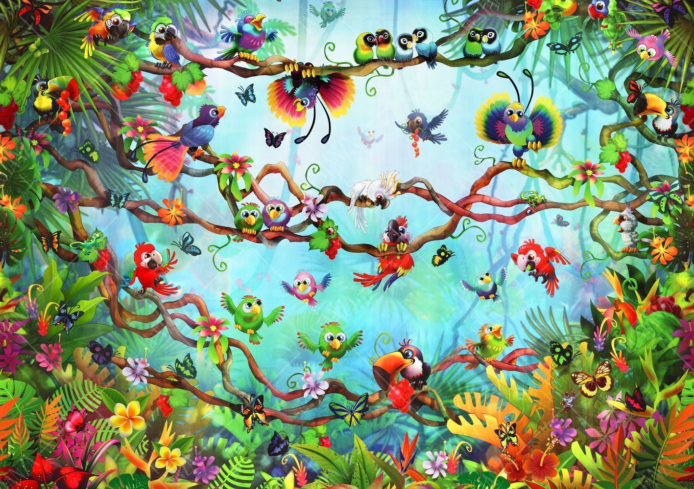 Фреска Панно джунгли — попугаи и птицы на ветках