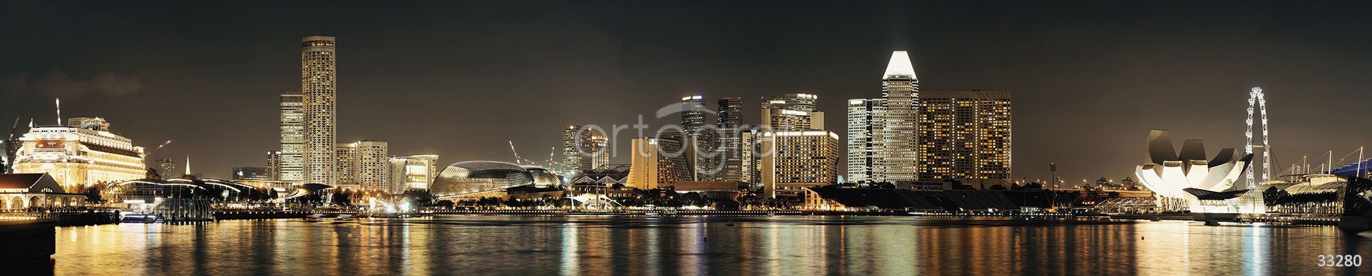 Панорамный вид на современный мегаполис с небоскребами, известными архитектурными постройками и огнями ночного города, отражающимися в воде. В кадре узнаются символы авангардной архитектуры и динамики городской жизни, что создает атмосферу энергичности и современности. Такой сюжет отлично подчеркнет урбанистический стиль в интерьере.