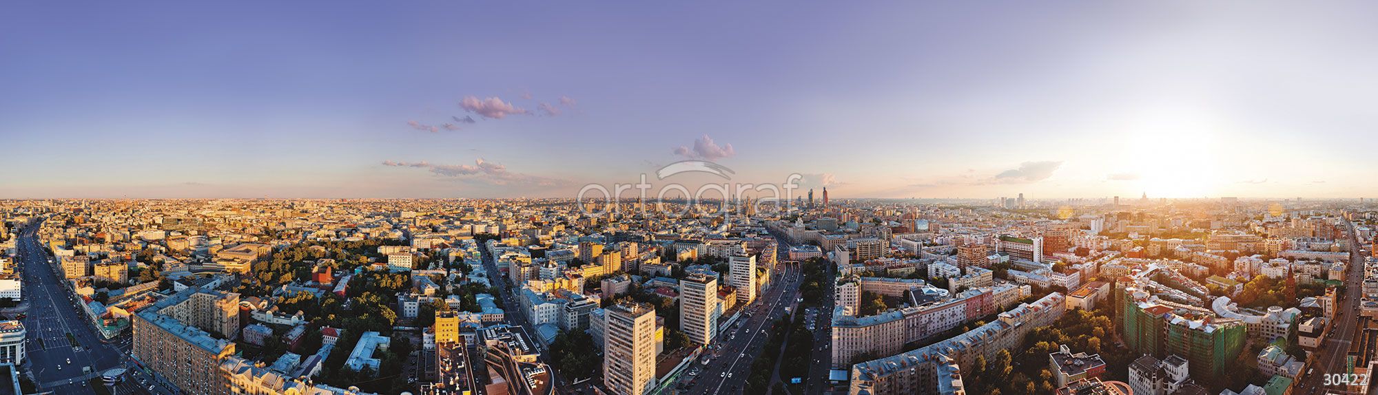 Перед нами панорамный вид крупного современного города с прямыми проспектами, высокими зданиями, зелёными парками и деловым центром на горизонте. Солнечный свет мягко освещает город, создавая ощущение простора и активности большого мегаполиса.