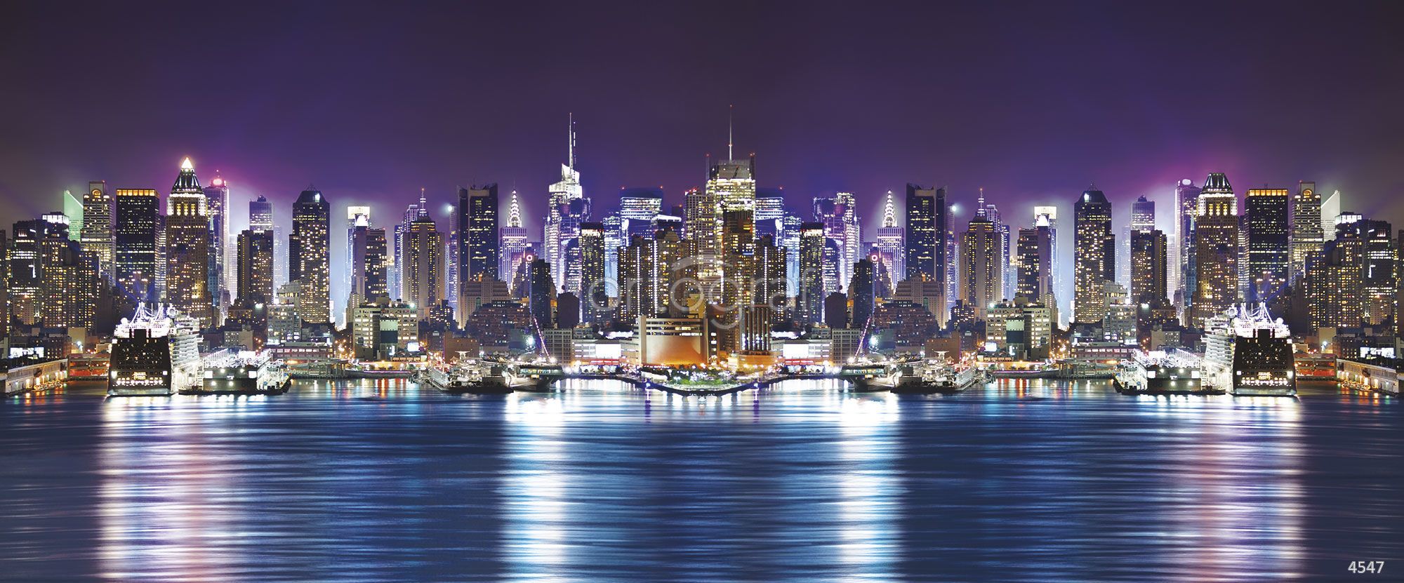 Панорама современного мегаполиса ночью с отражением города на воде создает динамичное и энергичное настроение. Такой урбанистический сюжет отлично подчеркивает современные и минималистичные интерьеры, добавляя акцент стиля и ритма большого города. Особенно подойдет для рабочих или общественных пространств, где важна атмосфера активности.