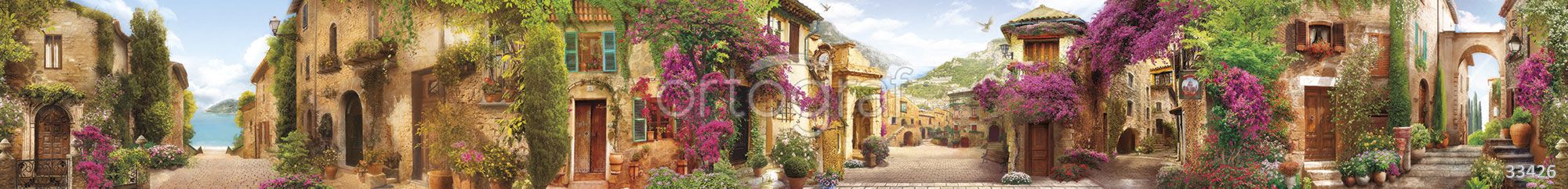 Уютная улочка средиземноморского городка с каменными домами, украшенными цветущими растениями, создает атмосферу покоя и солнечного настроения. Такой рисунок добавляет интерьеру ощущение путешествия, легкости и гармонии с природой, отлично подходит для уютного домашнего или гостевого пространства.