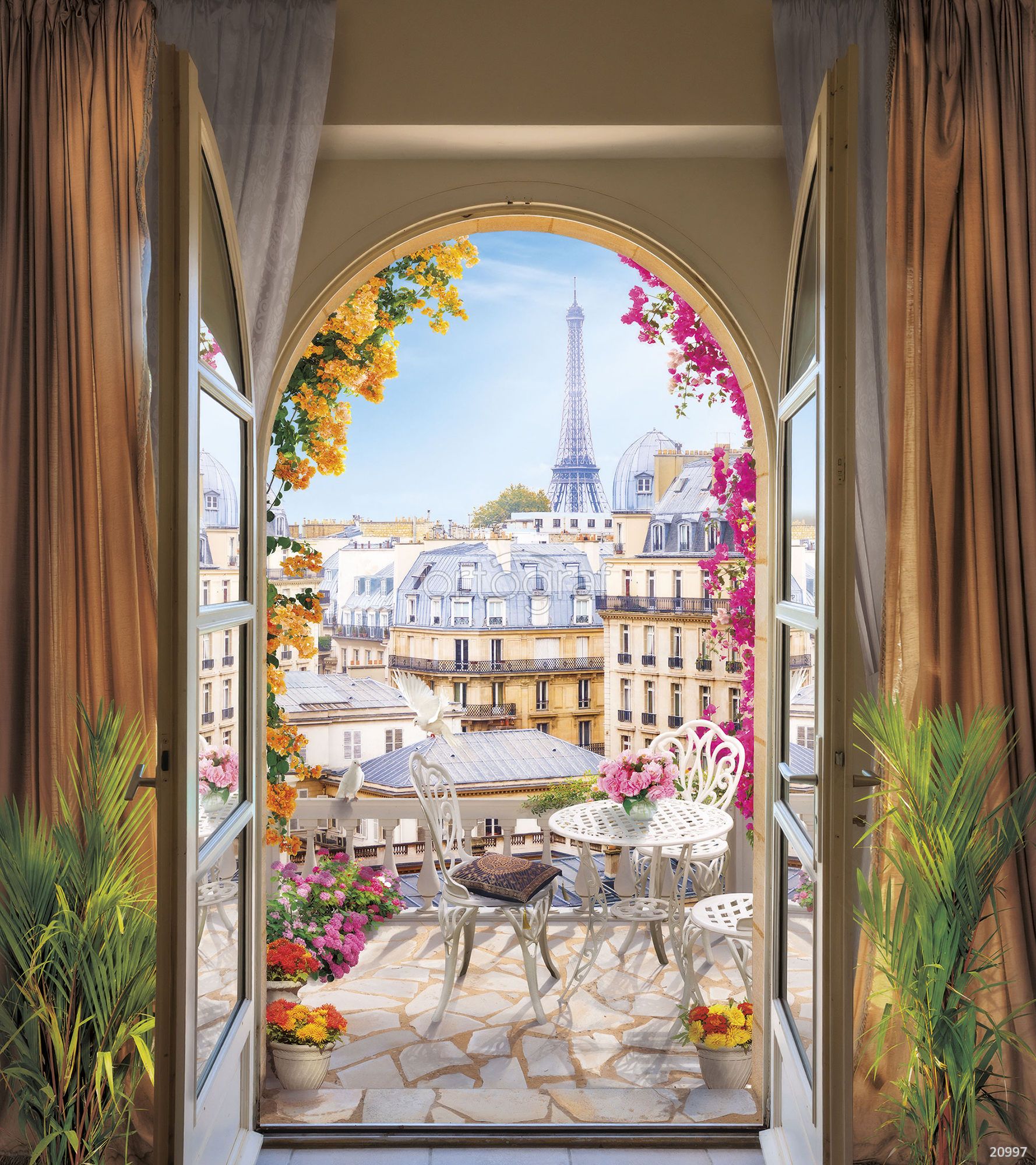 С уютного балкона открывается панорамный вид на городские крыши с ажурными фасадами и знаменитой башней на горизонте. На террасе изящная садовая мебель, цветы и зелёные растения создают атмосферу уюта, романтики и размеренного отдыха в большом городе.