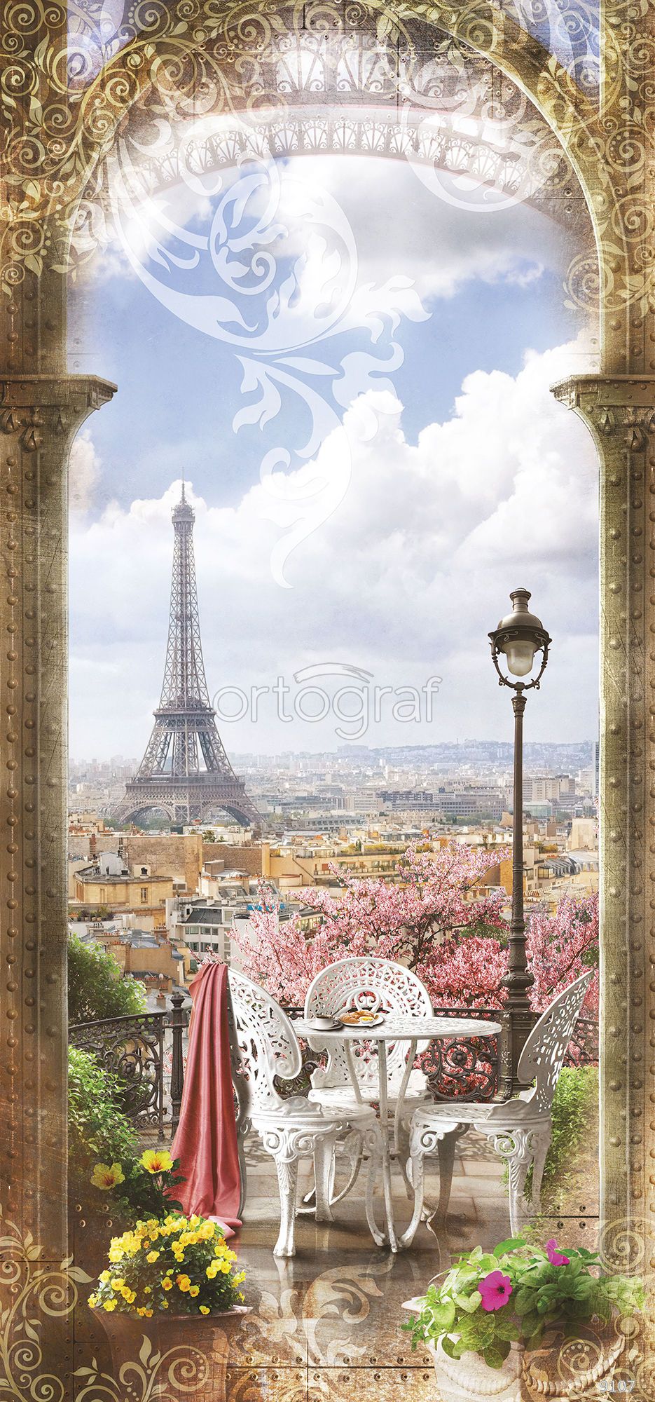 Арка с изысканным орнаментом открывает вид на Париж и Эйфелеву башню, уютную террасу с кованой мебелью и цветущими деревьями. Атмосфера утреннего отдыха и романтики идеально подойдет для создания ощущения уюта и воздушности в помещении. Такой сюжет добавляет интерьеру лёгкости и вдохновения.