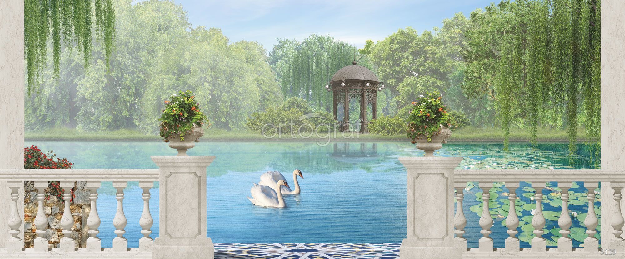 Роскошный вид на тихий пруд с лебедями, окружённый пышной зеленью, плакучими ивами и элегантной беседкой на заднем плане. Балюстрада и садовые вазы на переднем плане придают композиции изысканность и романтичность, обеспечивая ощущение покоя и гармонии с природой. Такая сцена идеально подходит для пространств, где важно создать расслабляющую, умиротворённую атмосферу.