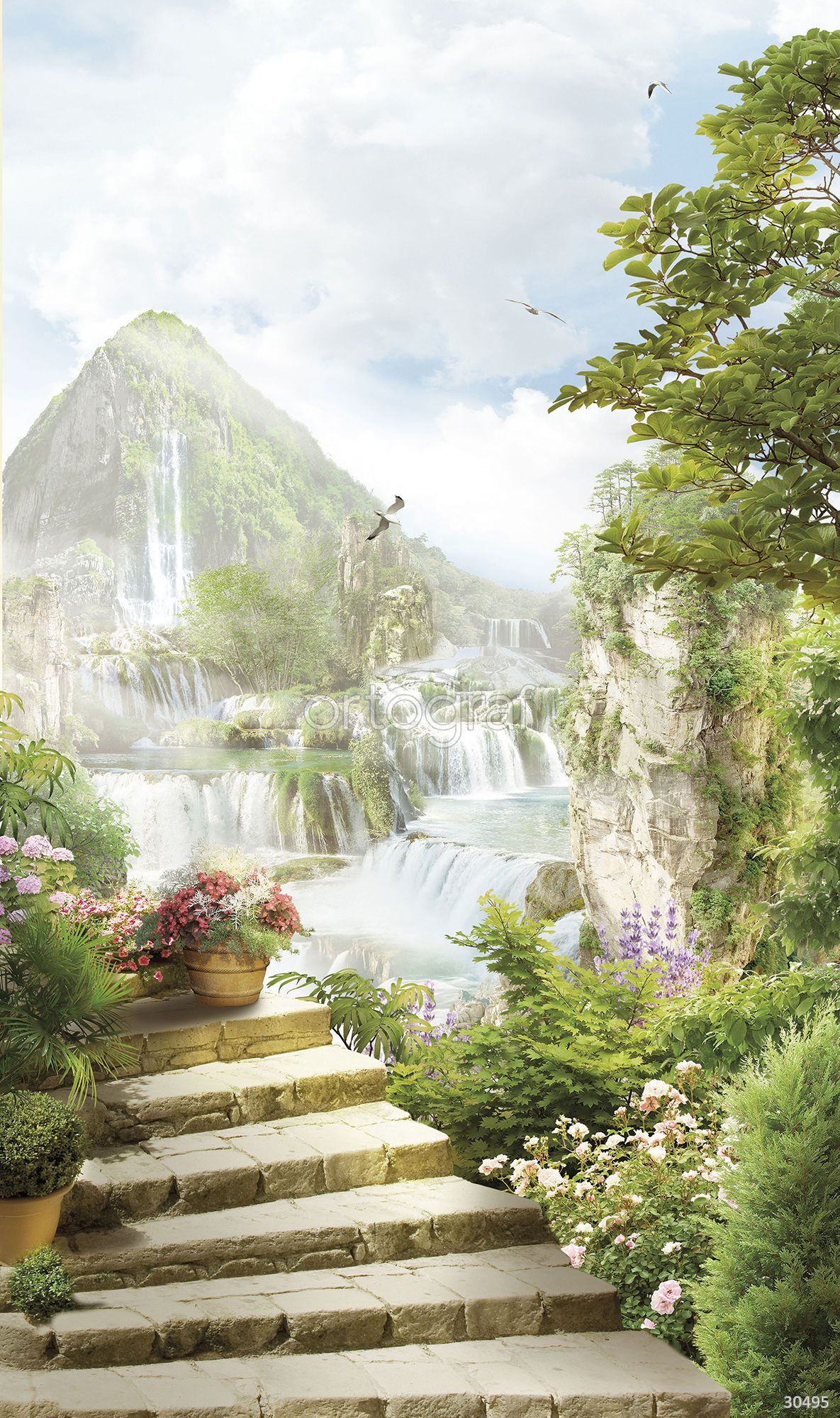 Сказочный сад, каменные ступени спускаются к живописным каскадам водопадов среди пышной зелени и цветущих растений. На заднем плане — горы и небо с парящими птицами, создающие ощущение покоя и уюта. Такая композиция отлично подойдет для гостиной, спальни или зоны релакса, наполняя интерьер свежестью и природной гармонией.