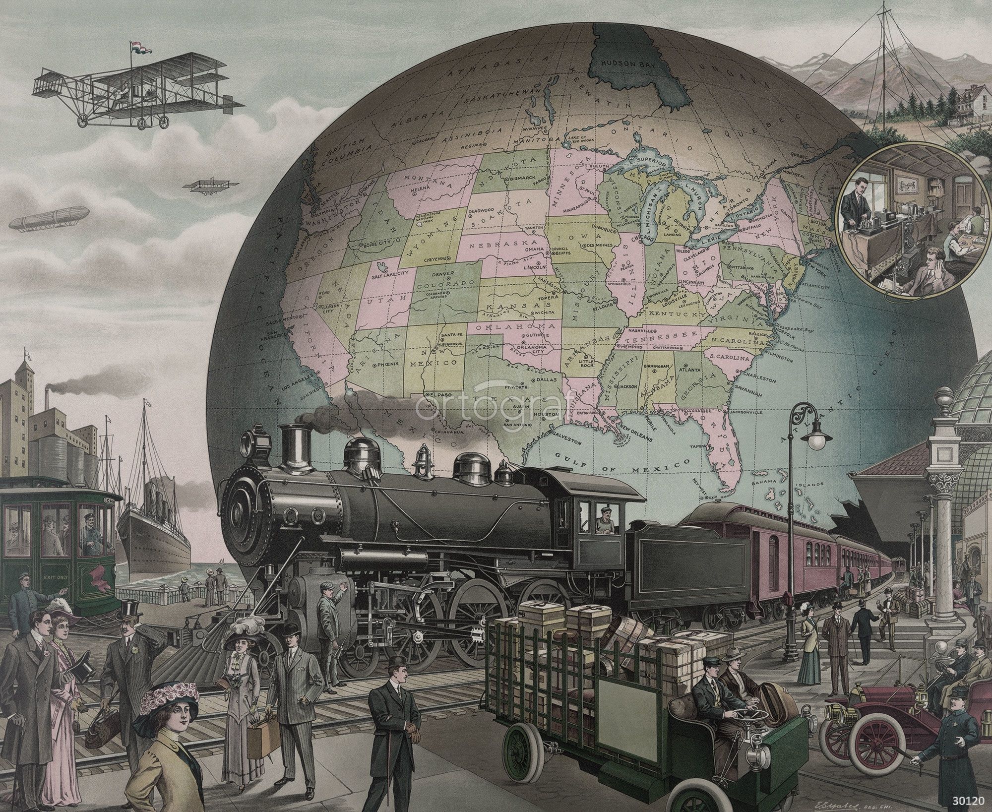 На изображении показан символический коллаж из технологических достижений эпохи индустриализации: крупный паровоз занимает центральное место на привокзальной площади, вокруг него кипит жизнь — люди спешат по делам, прибывают и отправляются на транспортных средствах. На фоне возвышается огромный глобус с картой Северной Америки, поверх которого помещены элементы прогресса: дирижабли, аэропланы, телеграфные провода, пароходы и первая автомашина. Композиция подчёркивает стремительное развитие транспорта и связи на рубеже XIX–XX веков и объединение континента с помощью новых технологий.
