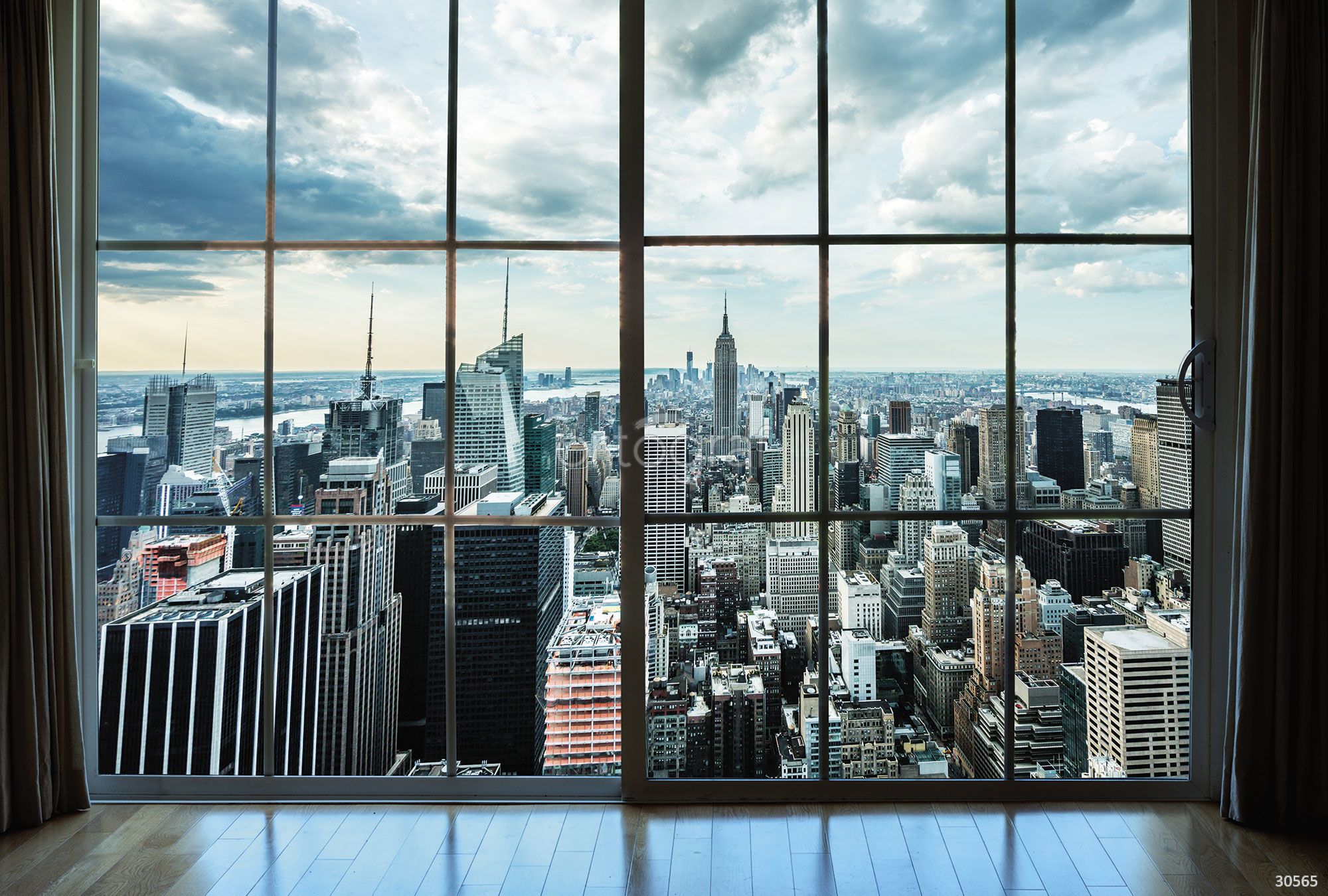 Панорамный вид на городской пейзаж с небоскрёбами, который открывается из просторной комнаты с большими окнами до пола. Композиция наполняет пространство ощущением света, динамики и современного ритма мегаполиса, подчёркивает урбанистический стиль и простор. Такой сюжет идеально подойдёт для современных интерьеров с акцентом на минимализм и открытые перспективы.