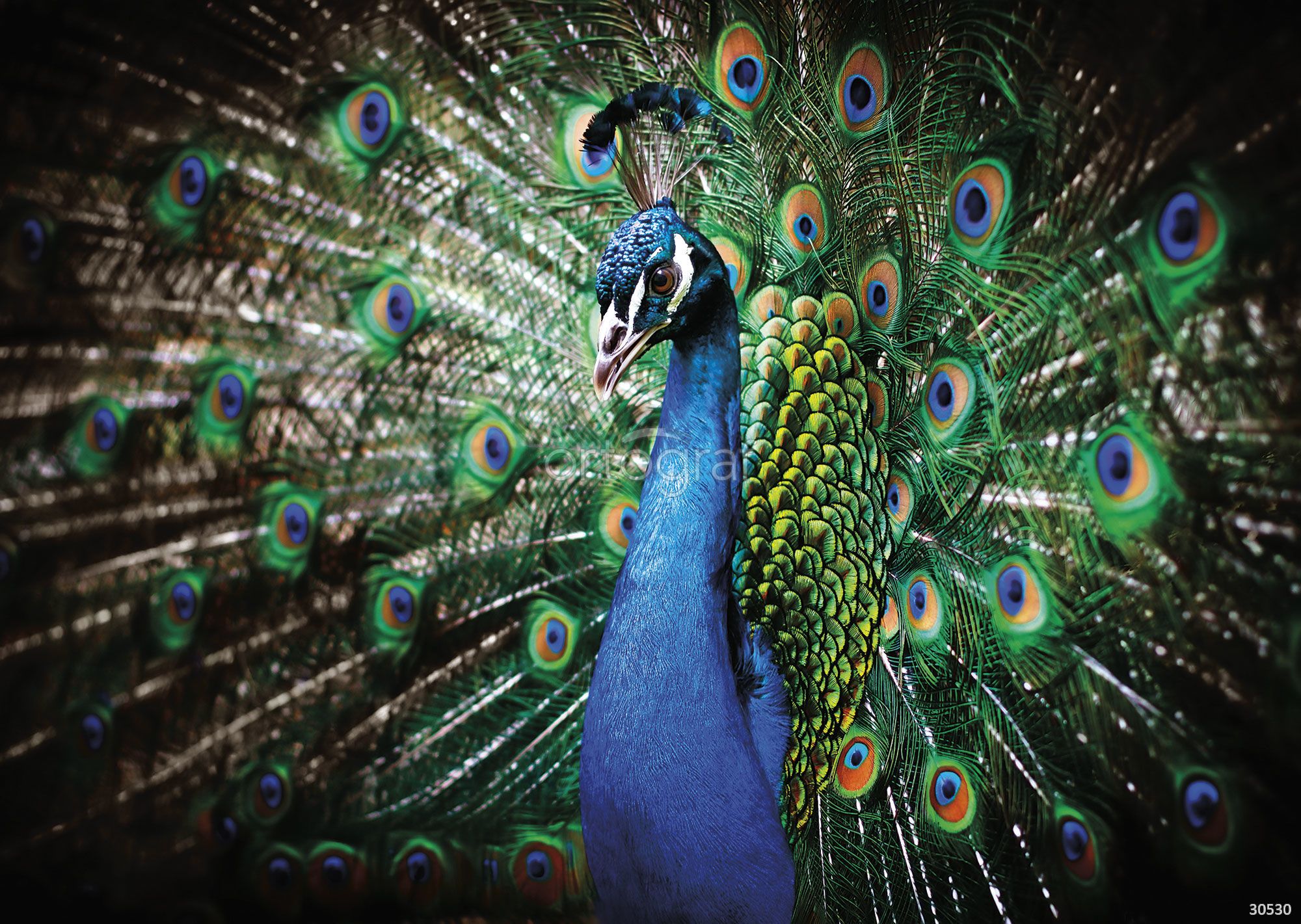 Портрет павлина с распущенным хвостом занимает центральное место на изображении, демонстрируя величие и изящество этой экзотической птицы. Динамика перьев и эффектный рисунок создают акцент в интерьере, наполняя пространство атмосферой роскоши и природной красоты. Такой сюжет отлично подчеркнёт индивидуальность современного или классического дизайна.