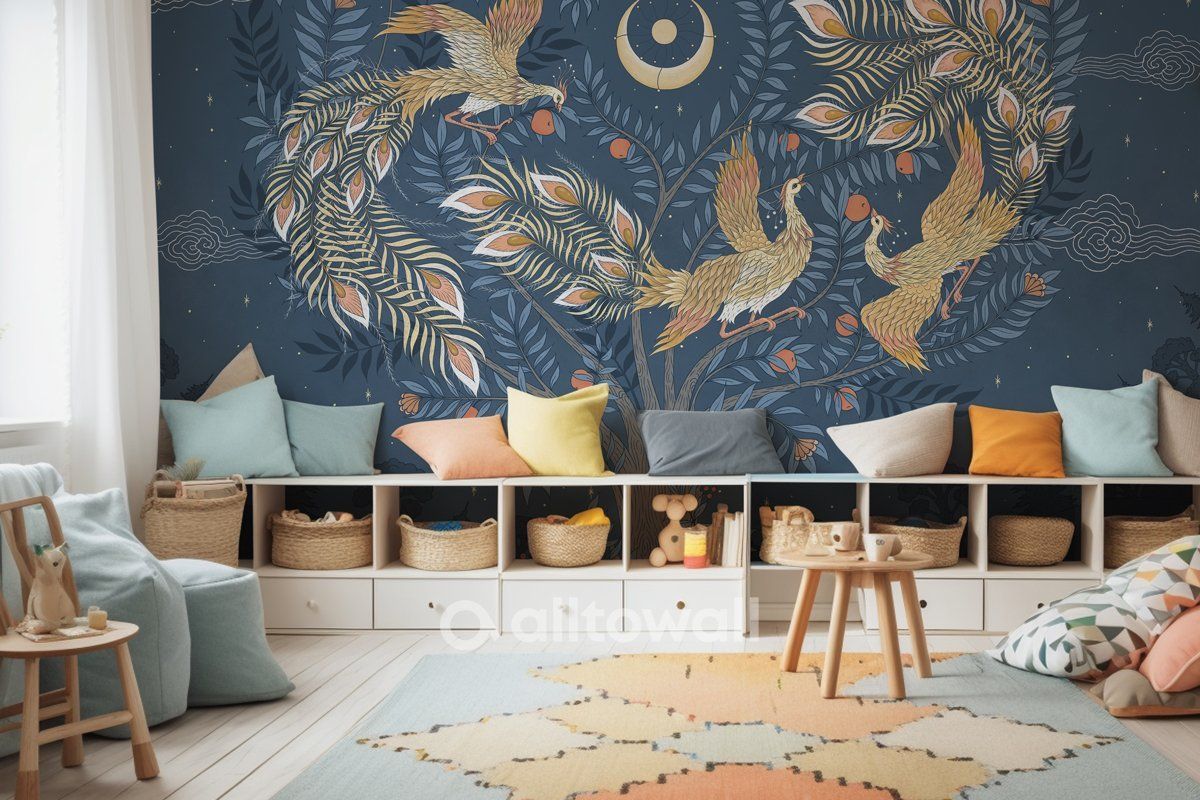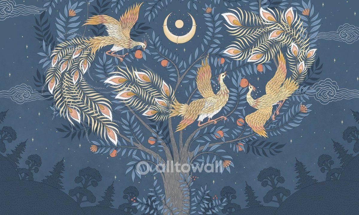 Сказочный сюжет «Перо Жар-птицы-4» посвящён загадочным существам, которые известны всем малышам. Необычная и мудрая птица с огненным оперением создаёт яркую обстановку, располагающую к отдыху и играм. Цветовая гамма комбинированная – тёмный фон, изображающий ночное небо с искрами звёзд, и резвящиеся на яблоне жар-птицы, которых озаряет сияние молодой Луны.