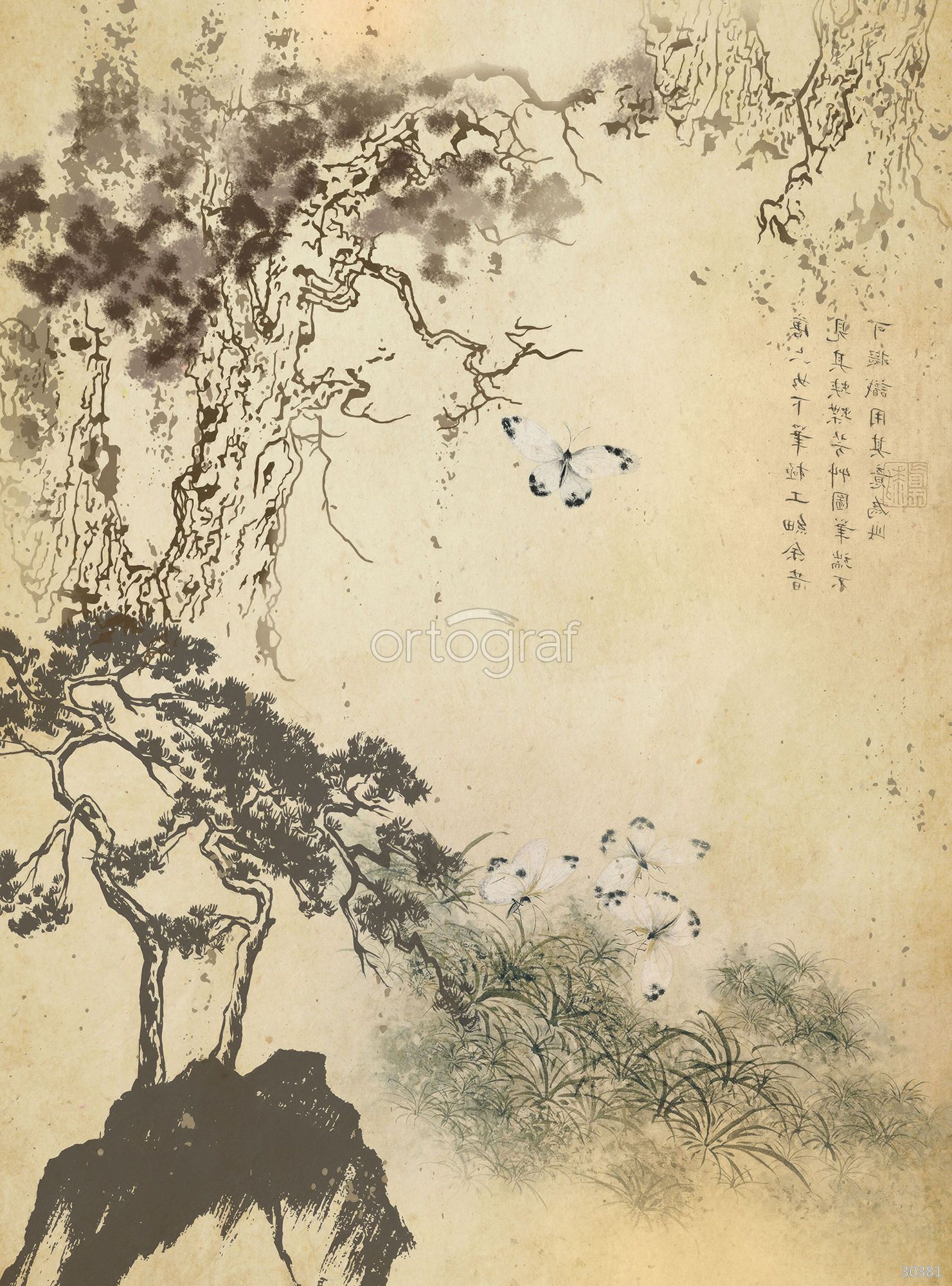 На картине в восточном стиле изображены причудливо изогнутые древние деревья, поросшие густой листвой, среди которых парят белоснежные бабочки. Внизу изображены травы и кусты, что создаёт ощущение лёгкости, гармонии и единения с природой в традициях китайской живописи.
