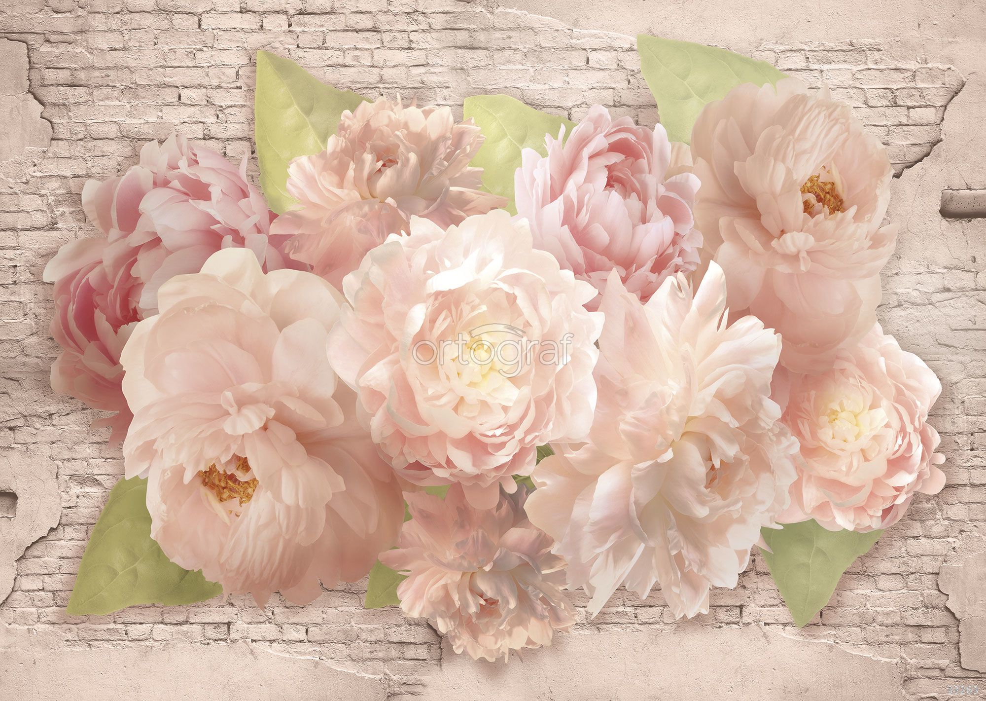 Нежные пионы и листья на фоне фактурной кирпичной стены создают романтичную и уютную атмосферу. Такой рисунок отлично подойдет для оформления пространства, которому хочется добавить легкости и теплоты, а также создать акцентную декоративную зону. Особенно гармонично смотрится в жилых комнатах и местах для отдыха.