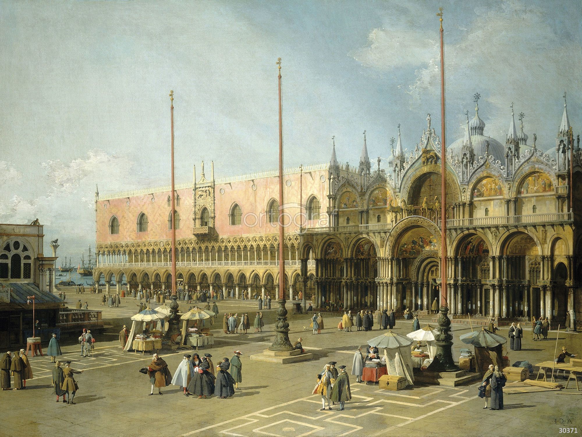Картина изображает оживлённую площадь перед величественным дворцом с арками и собором, вокруг которого расположились уличные торговцы и прогулочные горожане. На площади видны характерные флагштоки и группы людей, занятых беседами и покупками, что создаёт атмосферу повседневной городской жизни исторического европейского города.