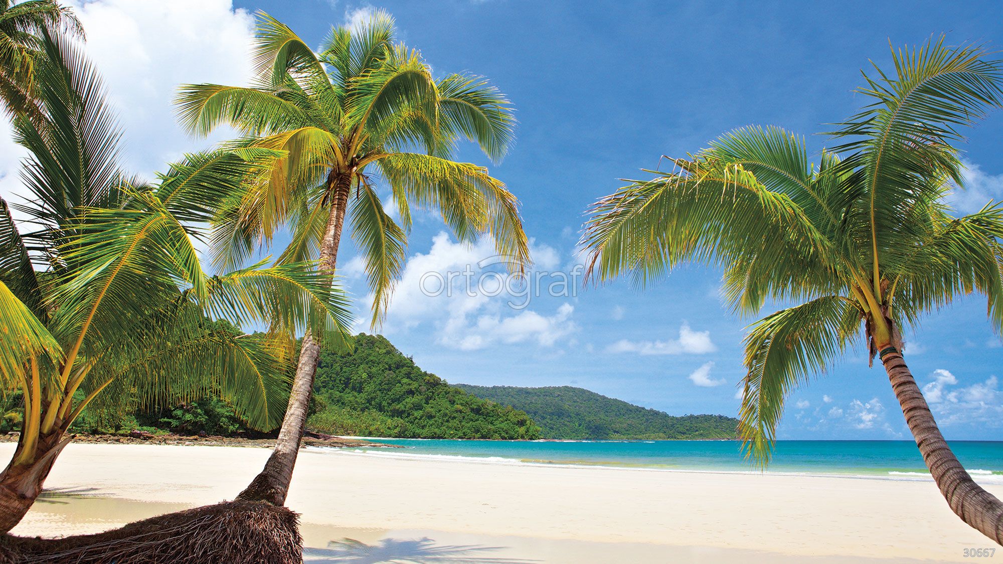 Экзотический пляж с белым песком, пальмами и бирюзовой водой, на фоне зелёных холмов и ясного неба. Атмосфера сюжета наполнена спокойствием, свежестью и ощущением уединения, идеально подходит для создания расслабляющего пространства. Такой рисунок хорошо дополняет интерьер с природным или морским акцентом.