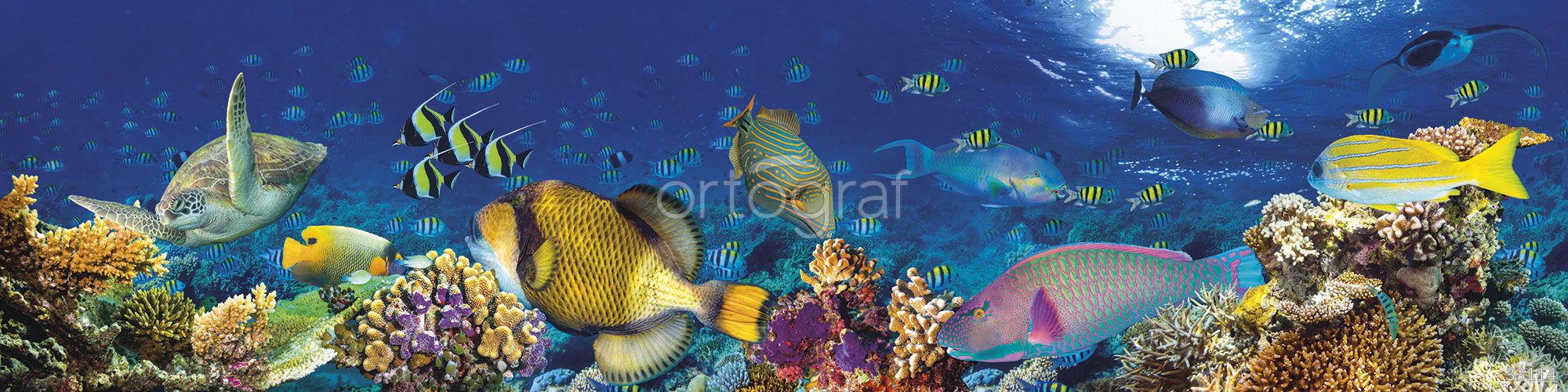 На изображении изображён красочный подводный мир с множеством видов рыб, кораллов, ската, черепахи и акулы. Океаническая сцена наполнена жизнью и движением, создаёт ощущение присутствия в тропическом рифе. Такой сюжет отлично подойдет для создания динамичной и яркой атмосферы в современном или семейном интерьере.