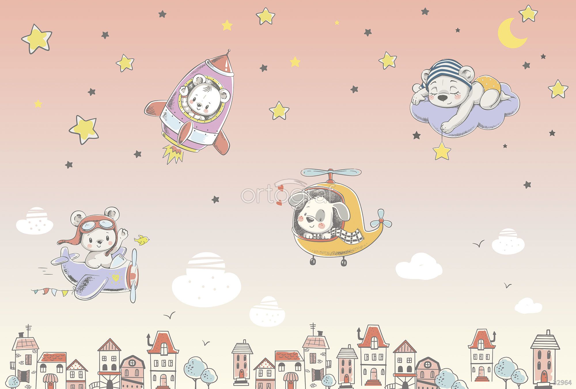 На изображении изображены медвежата и щенок, которые летают на самолёте, вертолёте, в ракете и спят на облаке среди звёздного неба и луны, а внизу нарисованы домики. Иллюстрация создаёт атмосферу мечты, путешествий и спокойного сна, отлично подойдёт для оформления детской или спальни для малышей.