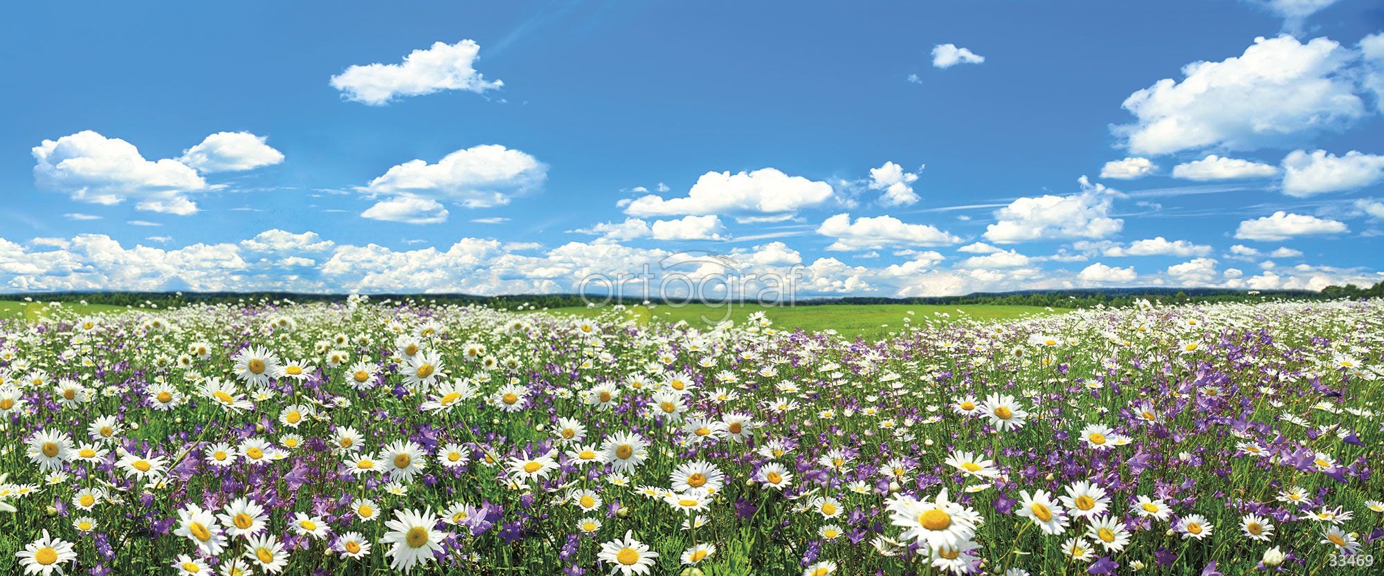 Панорамный вид на бескрайнее поле ромашек среди живописных лугов и отдалённых холмов, создающий ощущение простора, лёгкости и свежести. Такой сюжет наполняет пространство природной гармонией, позитивной атмосферой и визуально расширяет интерьер. Особенно хорошо подходит для помещений, где хочется подчеркнуть природную тематику и добавить нотки уюта.