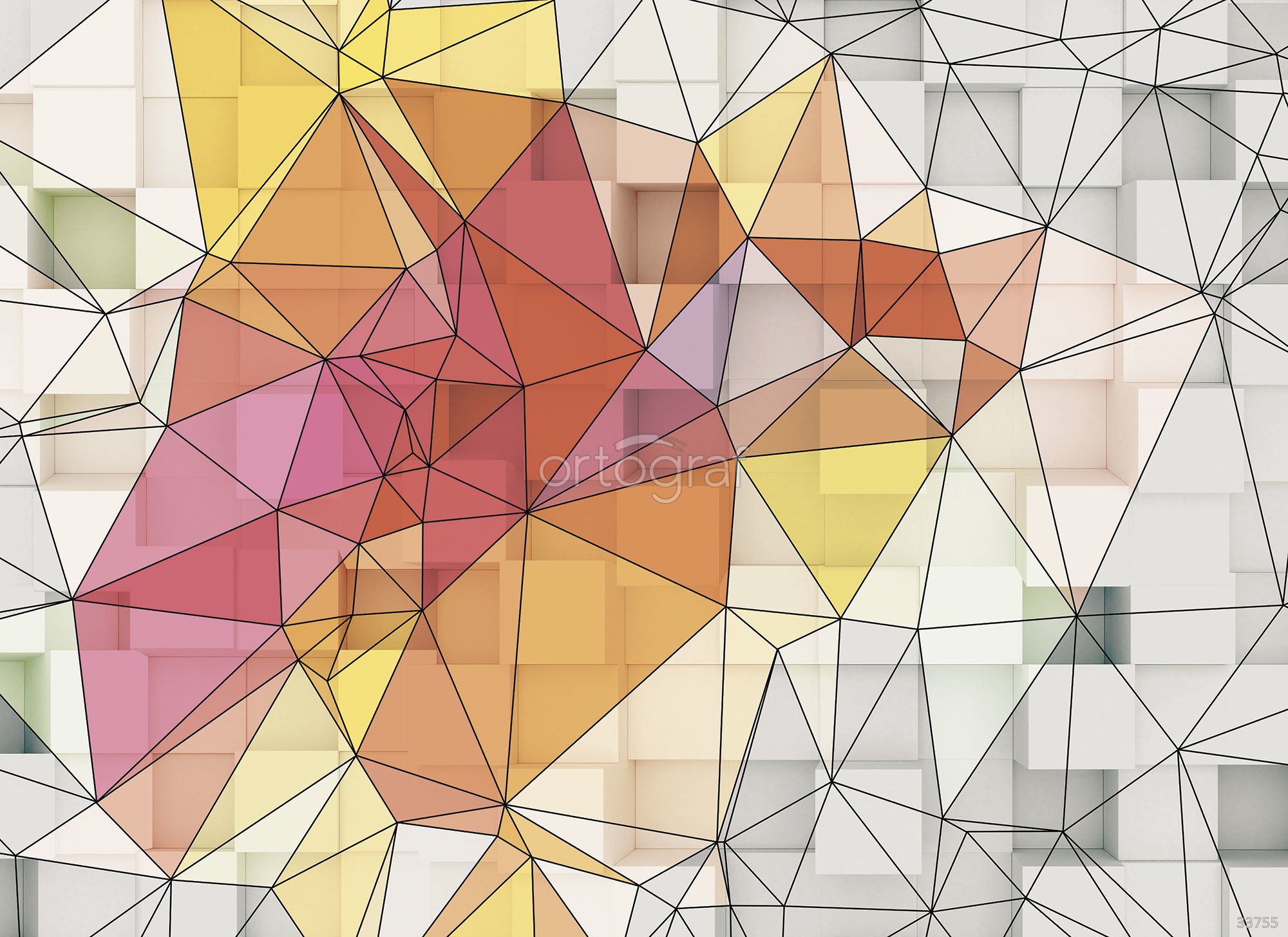 На этом изображении изображён абстрактный геометрический узор из множества многоугольников, наложенных на рельефный фон с кубическими элементами. Такой дизайн отлично дополнит современный интерьер, создавая стильный и динамичный акцент в помещении. Подходит для офиса, гостиной или прихожей и коридора, а также может использоваться для кухни.