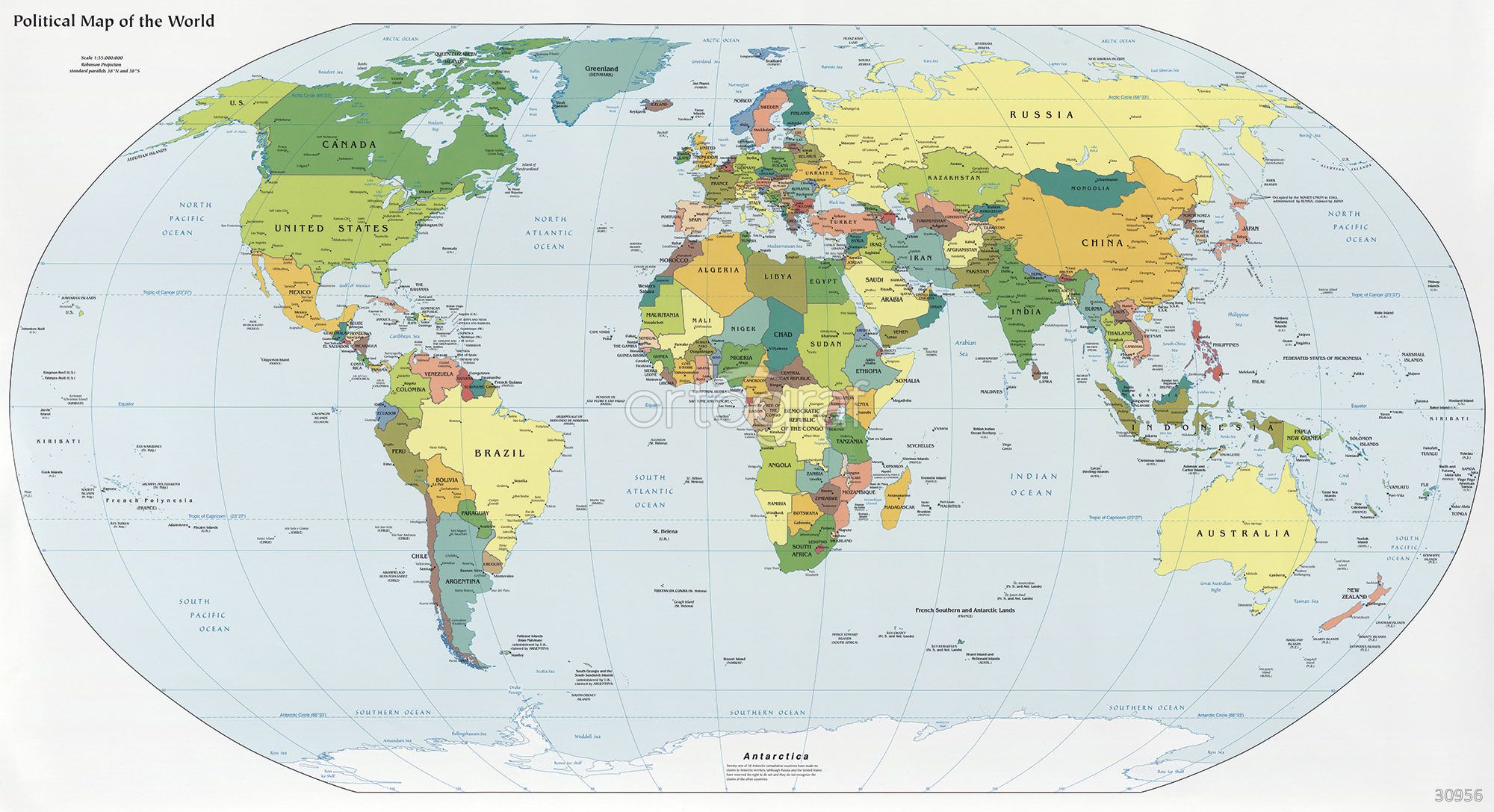 Карта мира с обозначением стран и границ, выполненная в классическом стиле, содержит подписи государств и географических объектов. Такой сюжет хорошо подойдет для оформления образовательного либо делового пространства, способствует приобретению новых знаний и вдохновляет на изучение мира. Карта гармонично впишется в любой интерьер, где важно создать атмосферу обучения и информативности.